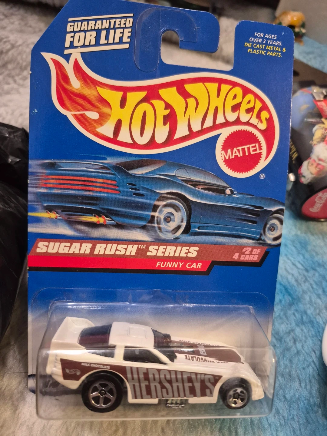 This is a Hot Wheels Sugar Rush Series Funny Car featuring Hershey's branding. It's a die-cast metal and plastic vehicle. This item is #2 of 4 cars in the series. It's guaranteed for life and recommended for ages over 3 years.