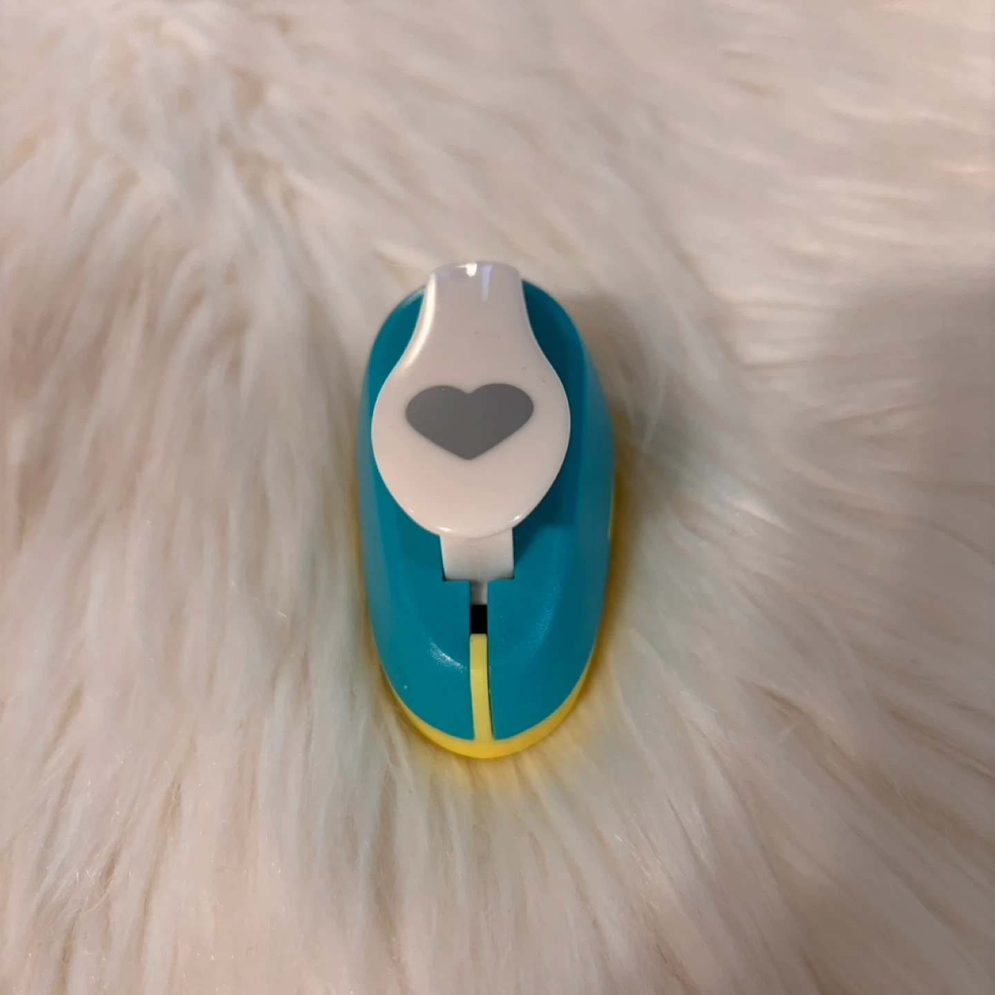 This craft punch creates small heart shapes. It's blue and yellow with a grey heart detail. Great for scrapbooking and card making projects!