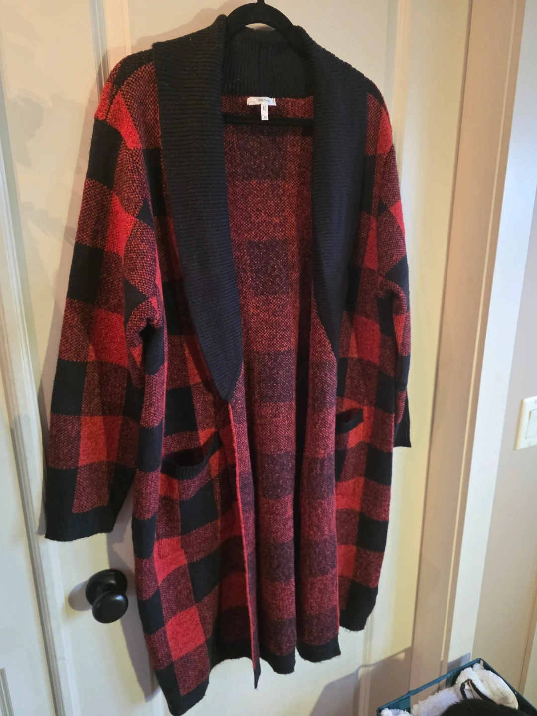 This is a cozy, longline cardigan sweater from Maurices. It's a size 2X and features a classic red and black buffalo plaid pattern. Two front pockets add extra convenience!