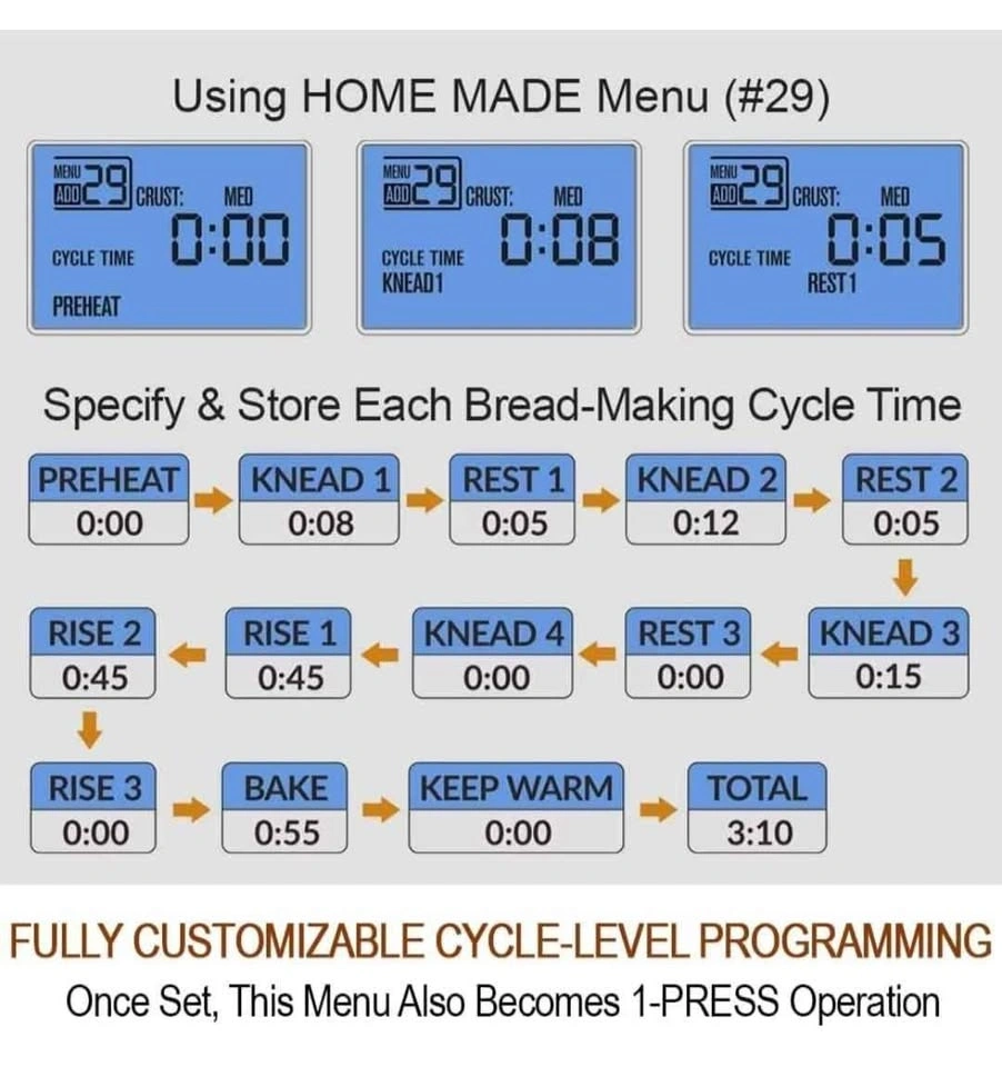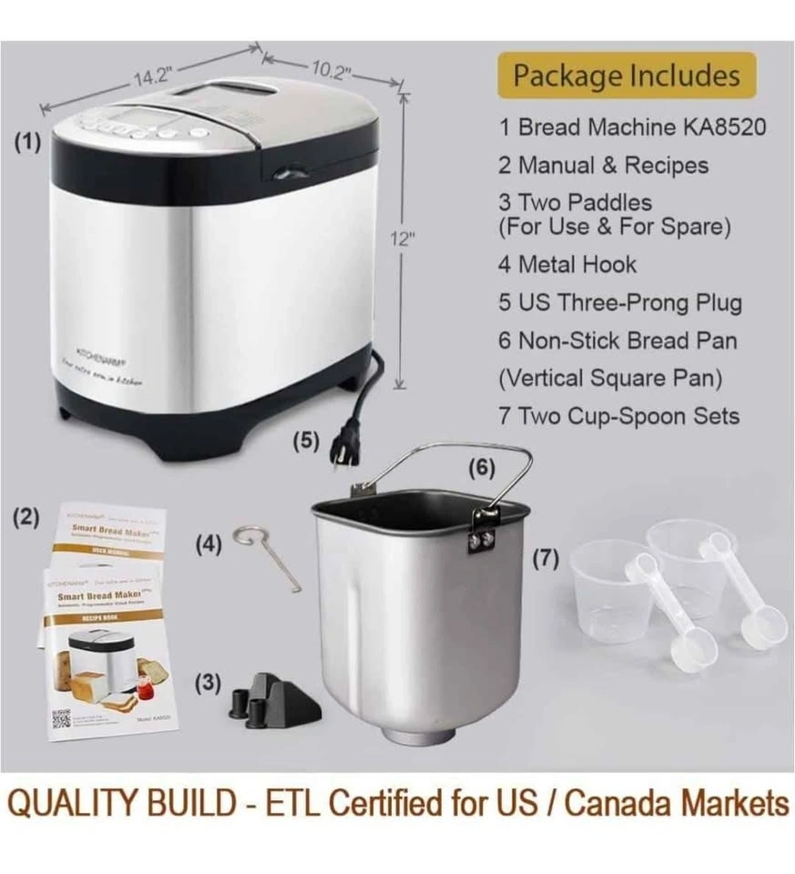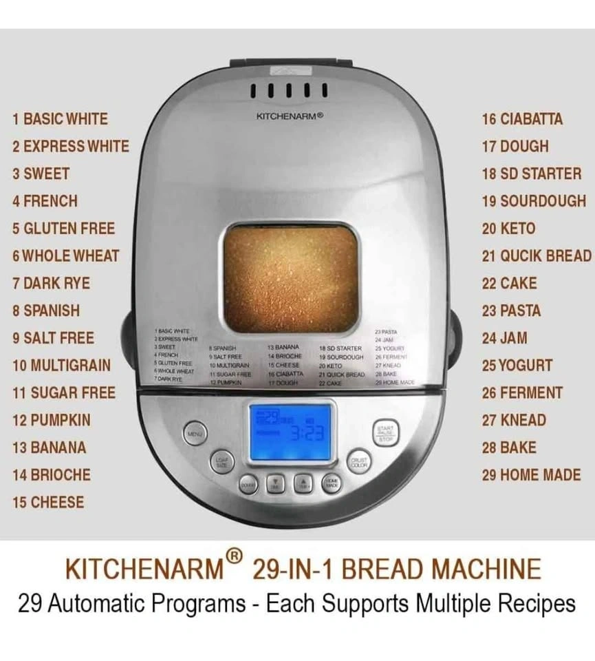 Brand new KITCHENARM 29-in-1 SMART Bread Machine with Gluten Free Setting. Makes 2LB, 1.5LB, and 1LB loaves. Features a homemade cycle and comes in stainless steel. Includes recipes. Feel free to message if you have any questions!