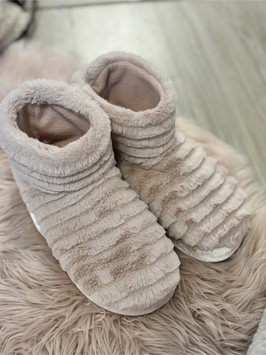 Cozy massager slippers with a soft fuzzy exterior. They feature a ribbed texture design and a comfortable plush lining. These slippers are perfect for keeping your feet warm on chilly days!