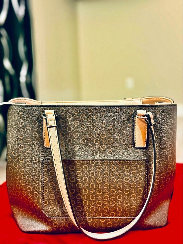 Beautiful GUESS handbag in classic brown with signature logo pattern and beige straps. Stylish, spacious, and perfect for everyday use, work, or outings.