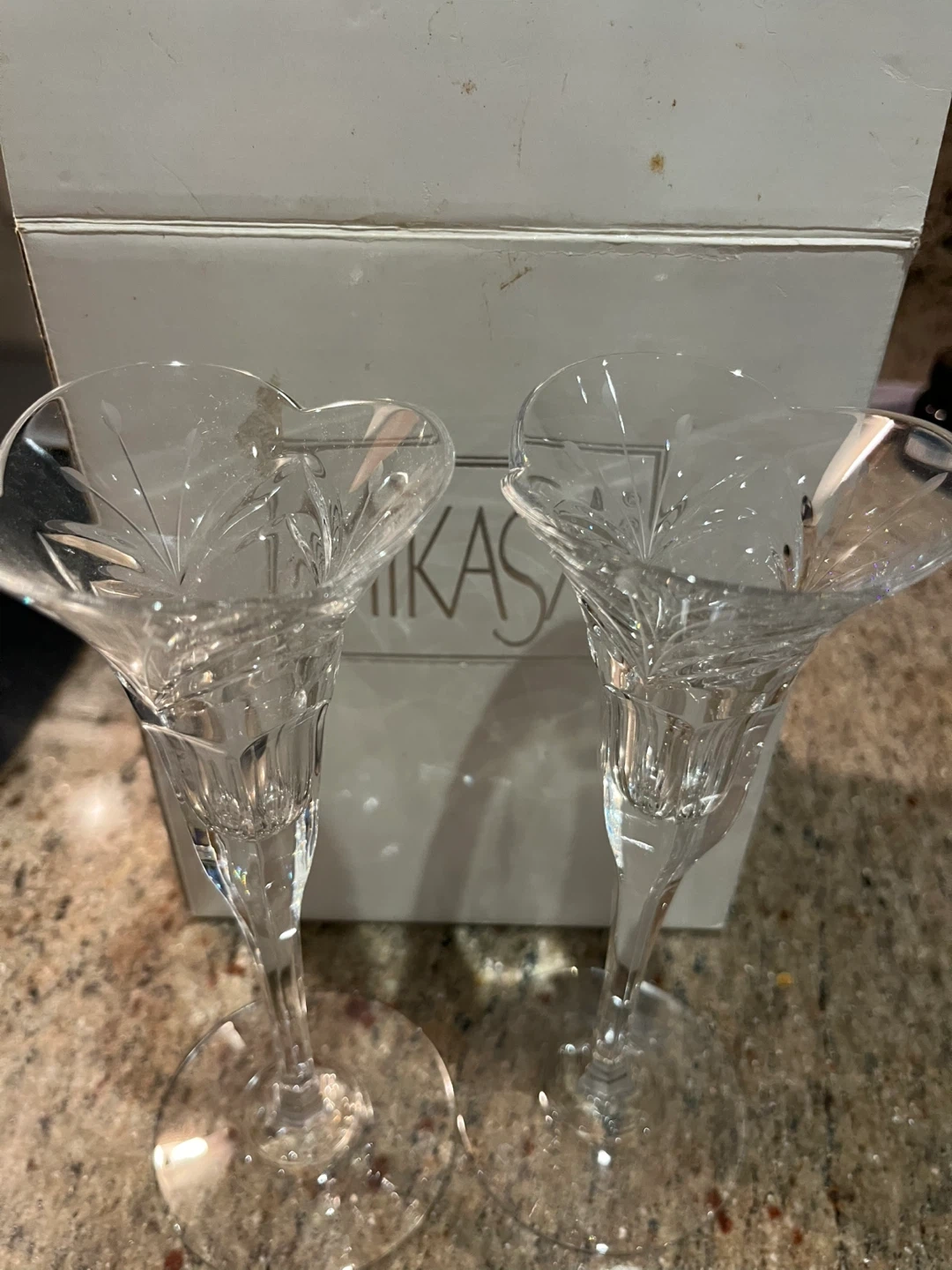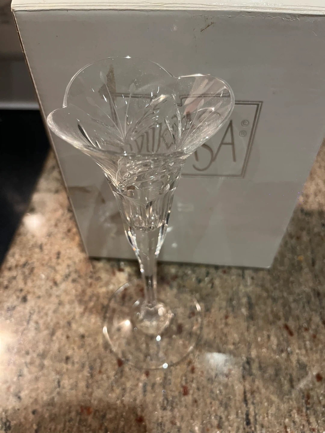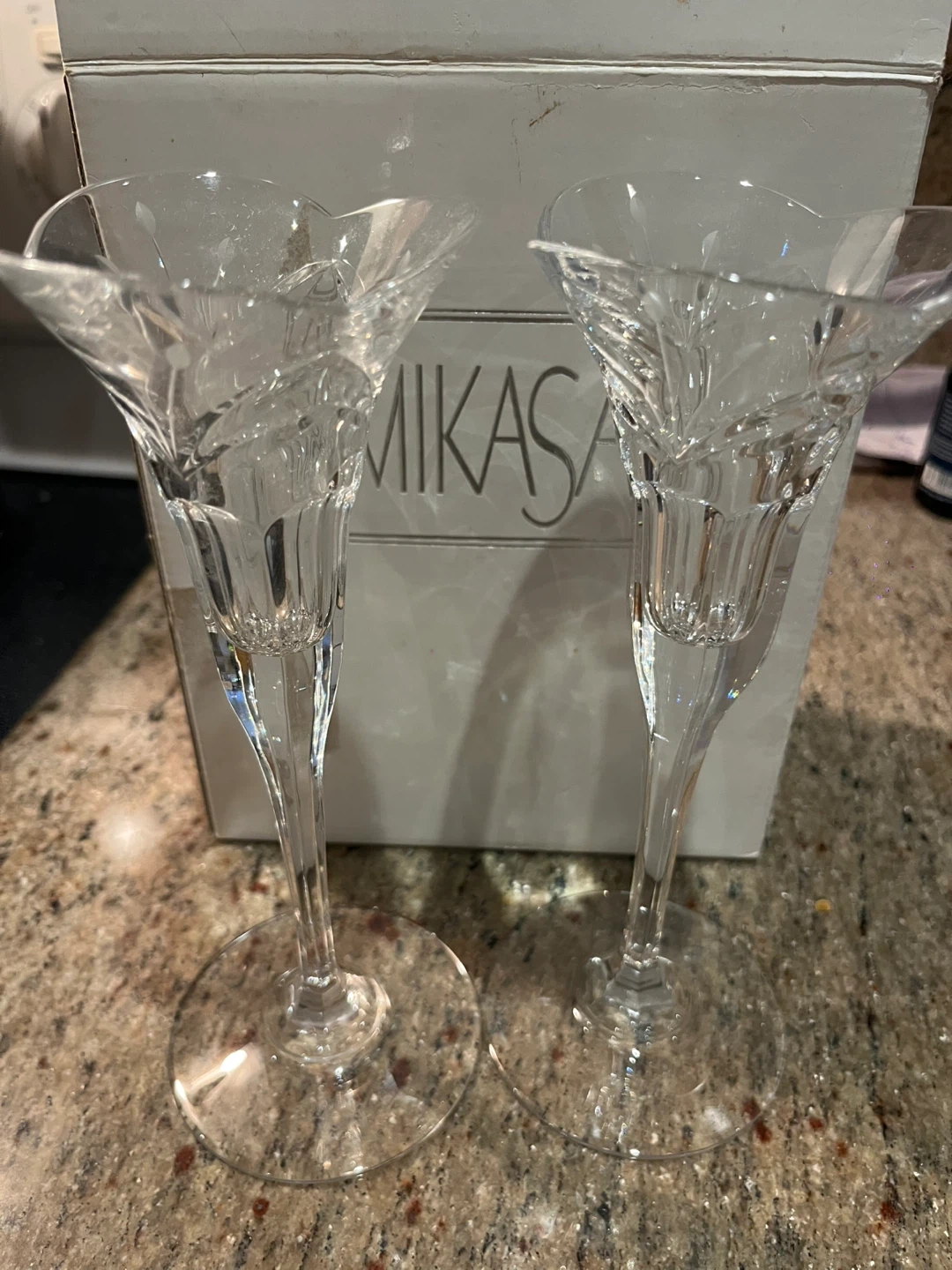 A pair of elegant Mikasa crystal candlestick holders. These beautiful holders have a delicate, fluted design perfect for adding a touch of sparkle to any table setting. Made of clear crystal glass.