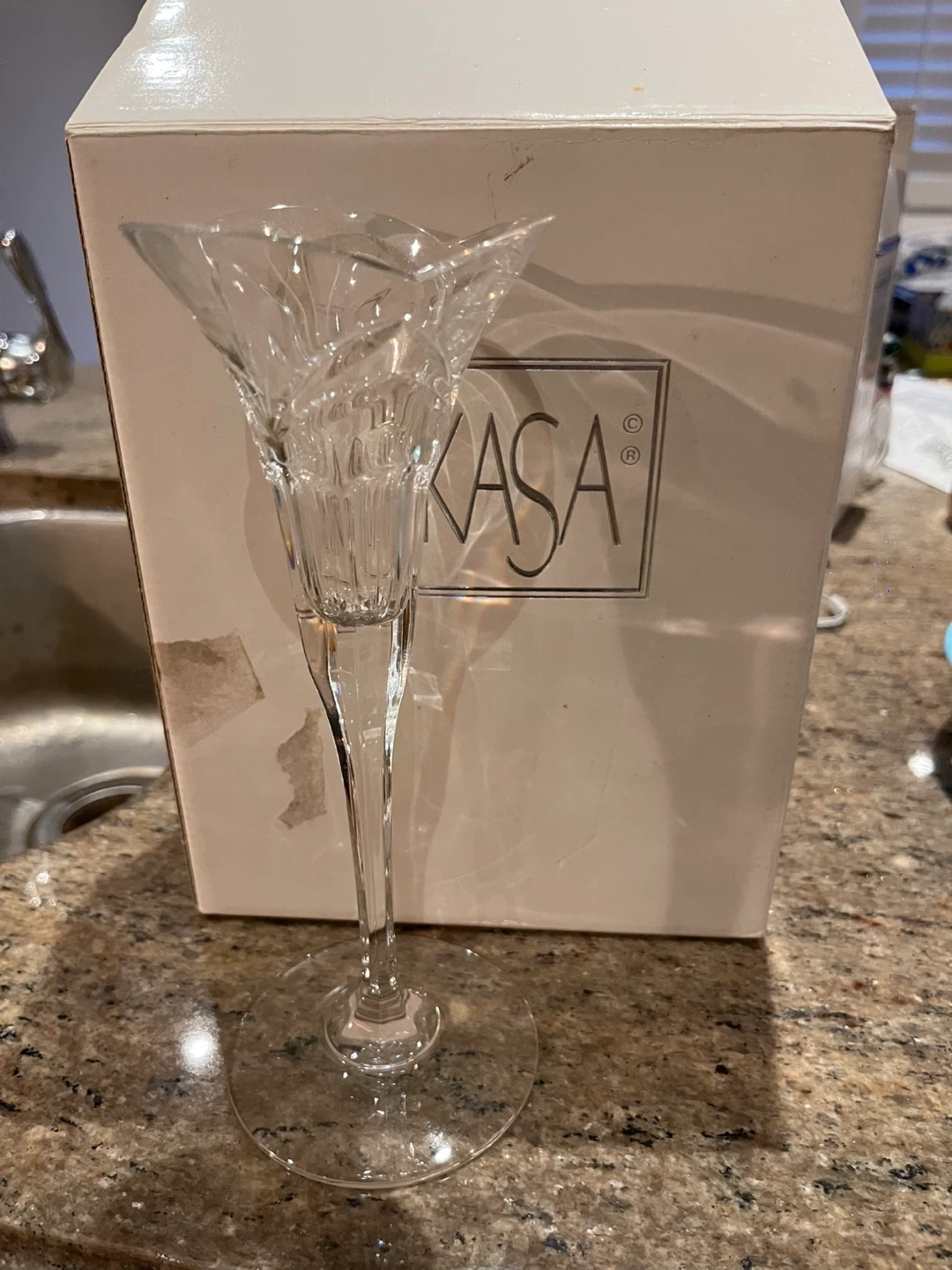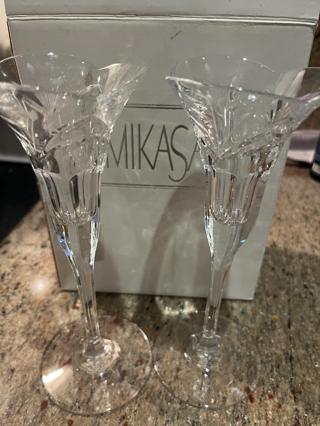 A pair of elegant Mikasa crystal candlestick holders. These beautiful holders have a delicate, fluted design perfect for adding a touch of sparkle to any table setting. Made of clear crystal glass.