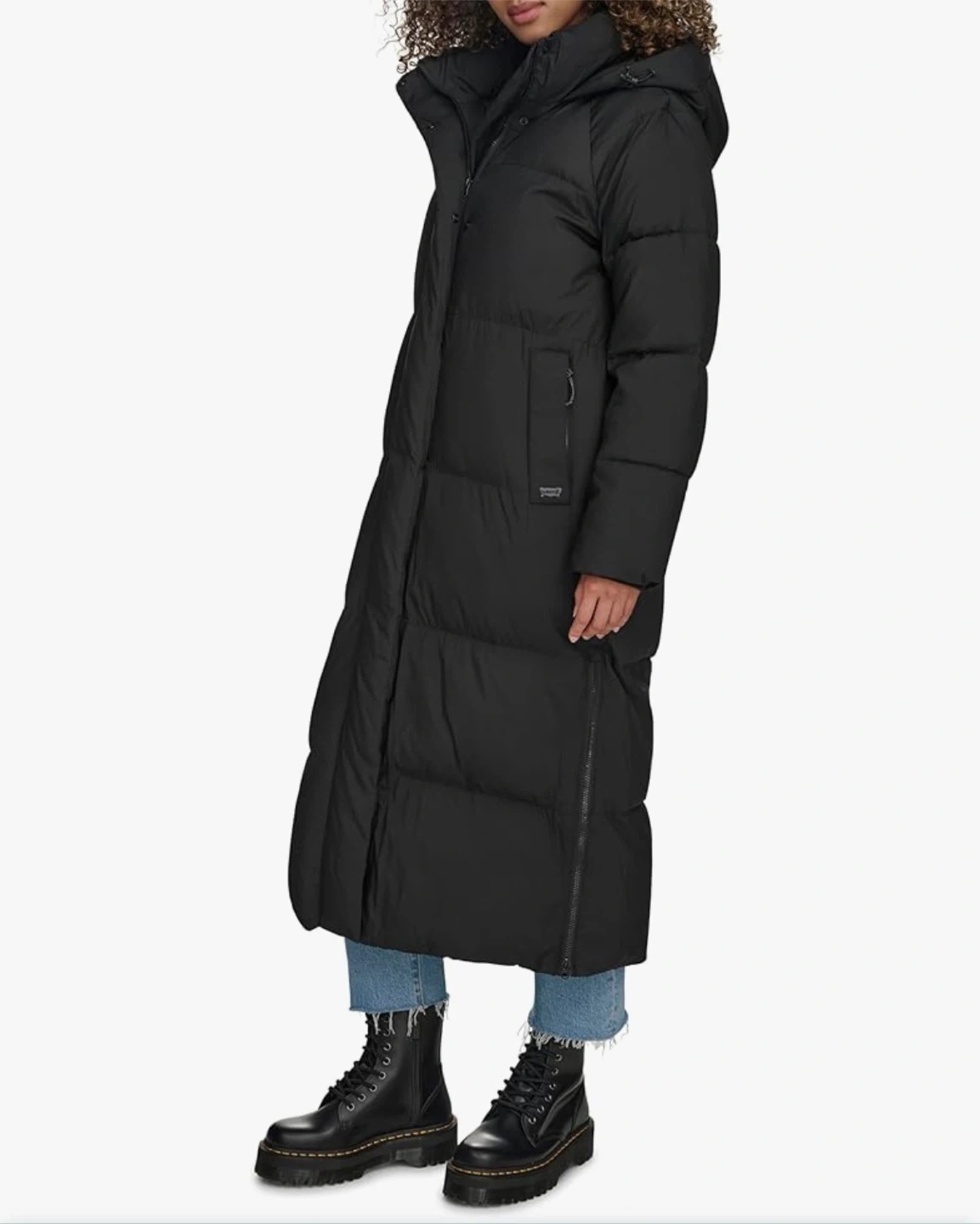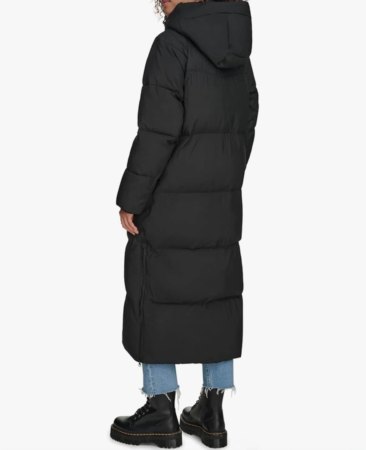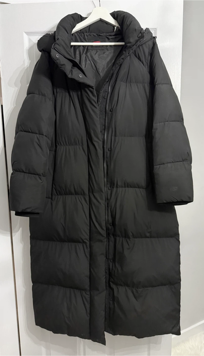 Stay warm in this long black puffer coat from Levi's. It's designed with a hood and full zip closure. Material is water-resistant.