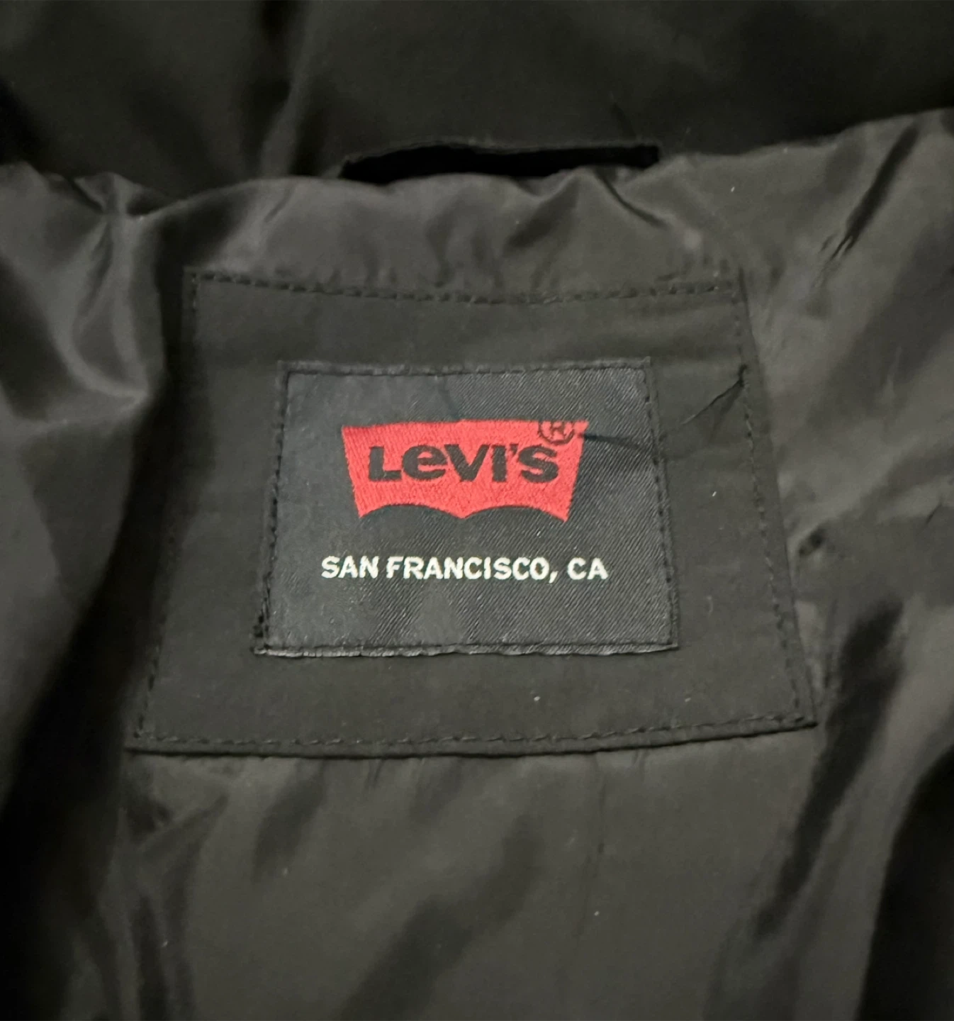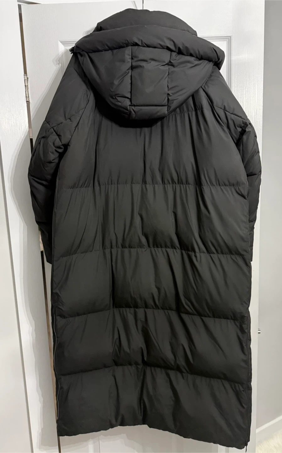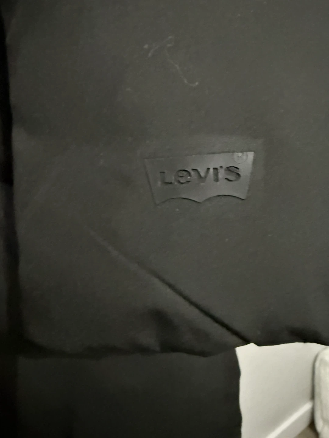 Stay warm in this long black puffer coat from Levi's. It's designed with a hood and full zip closure. Material is water-resistant.
