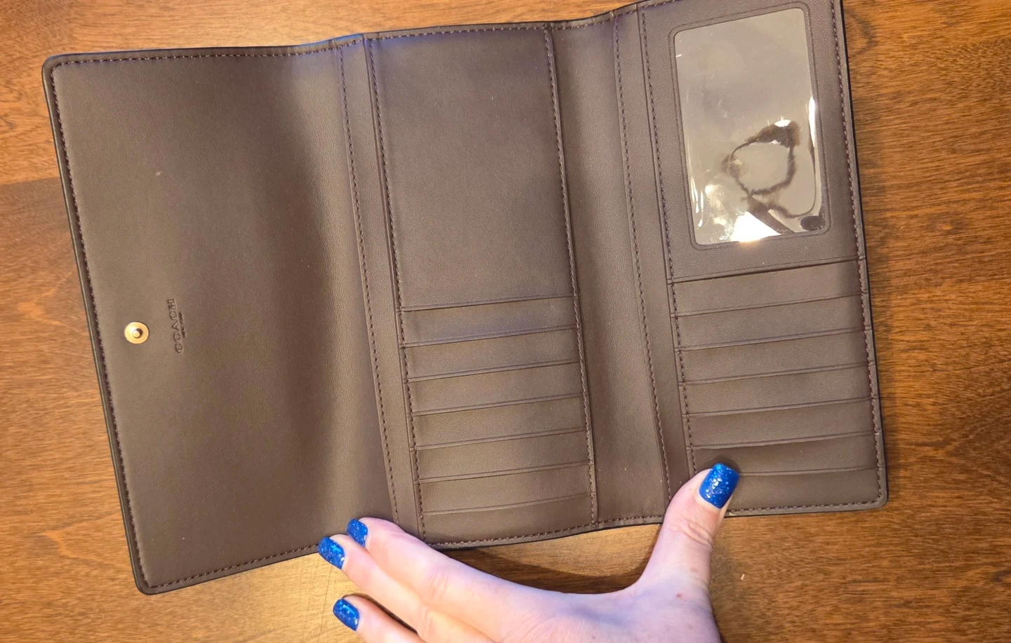 Trifold wallet in Deep Berry/Khaki with muliple card slots and an ID window