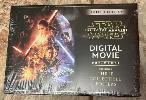 Star Wars: The Force Awakens limited edition digital movie bundle. Includes three collectible posters. Brand new in box, never opened. Still sealed. Experience the thrill of the epic space saga with Harrison Ford, John Boyega, Domhnall Gleeson, Mark Hamill, and Carrie Fisher. Relive the excitement of the 2015 release and add this limited edition movie to your collection today.