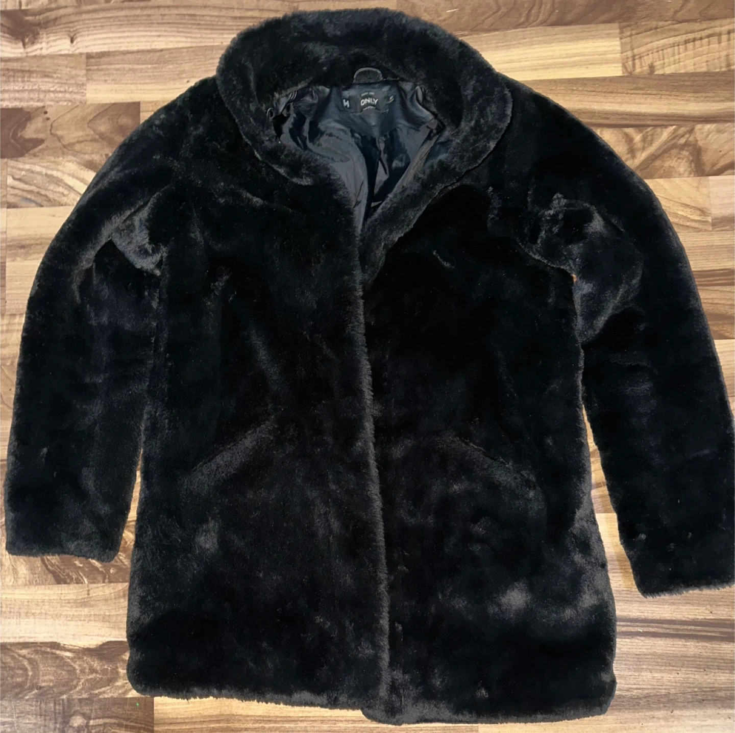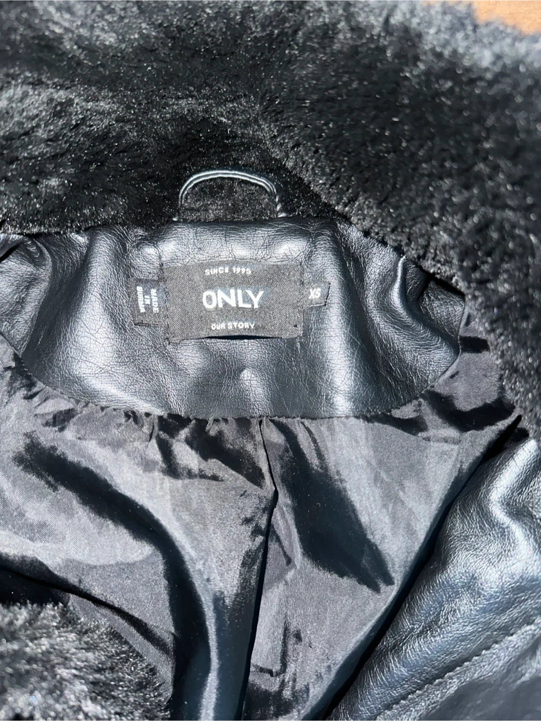 This is an ONLY brand black faux fur jacket. It's a size XS with a faux leather collar and lining. The jacket is perfect for keeping warm on cooler days!