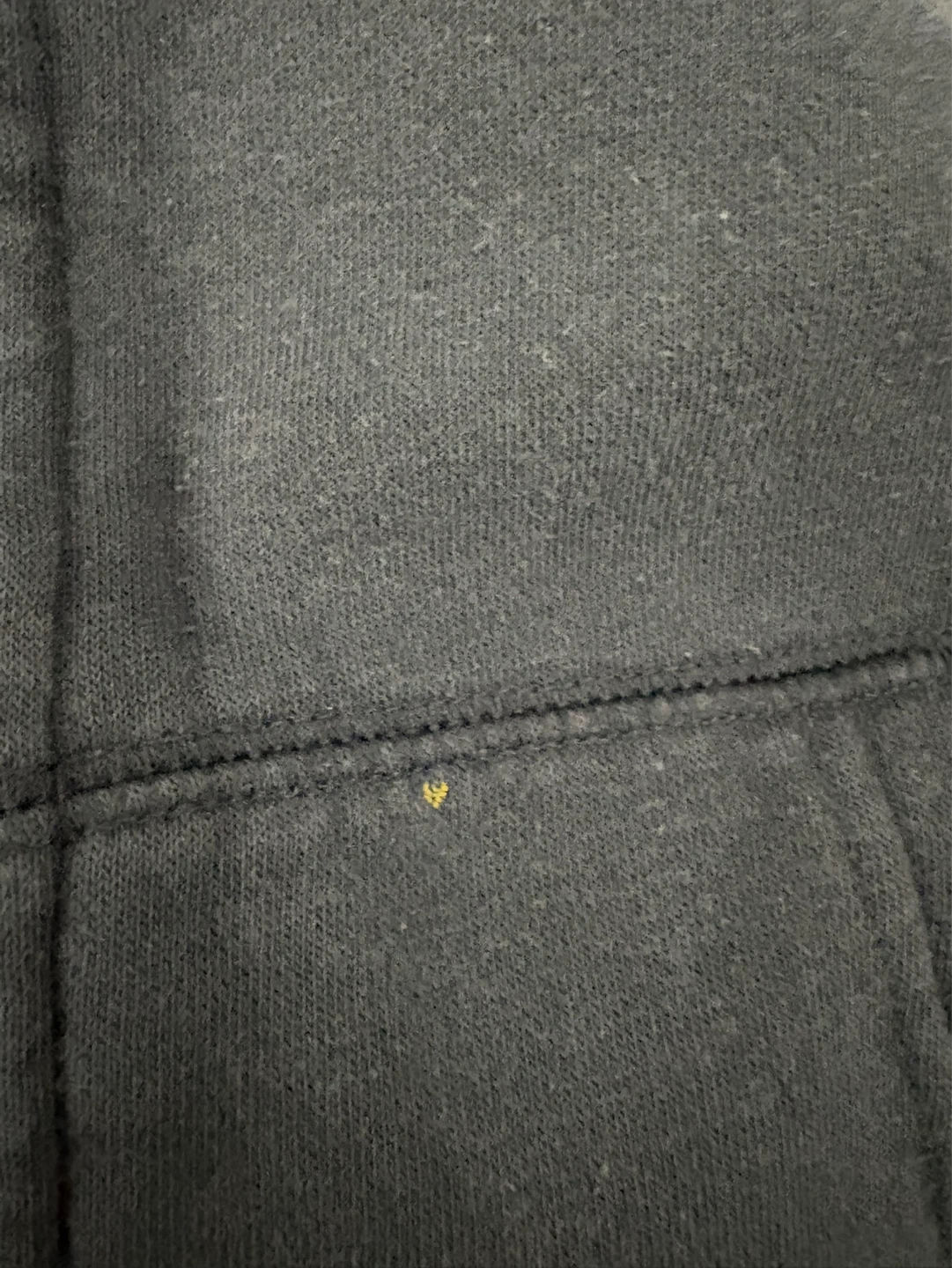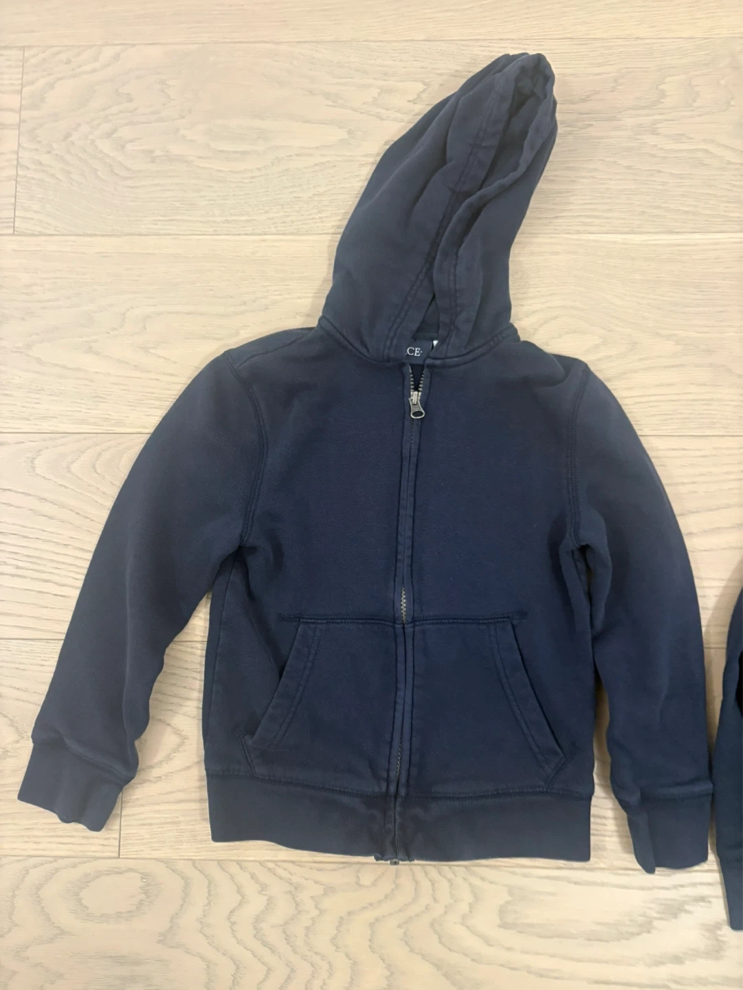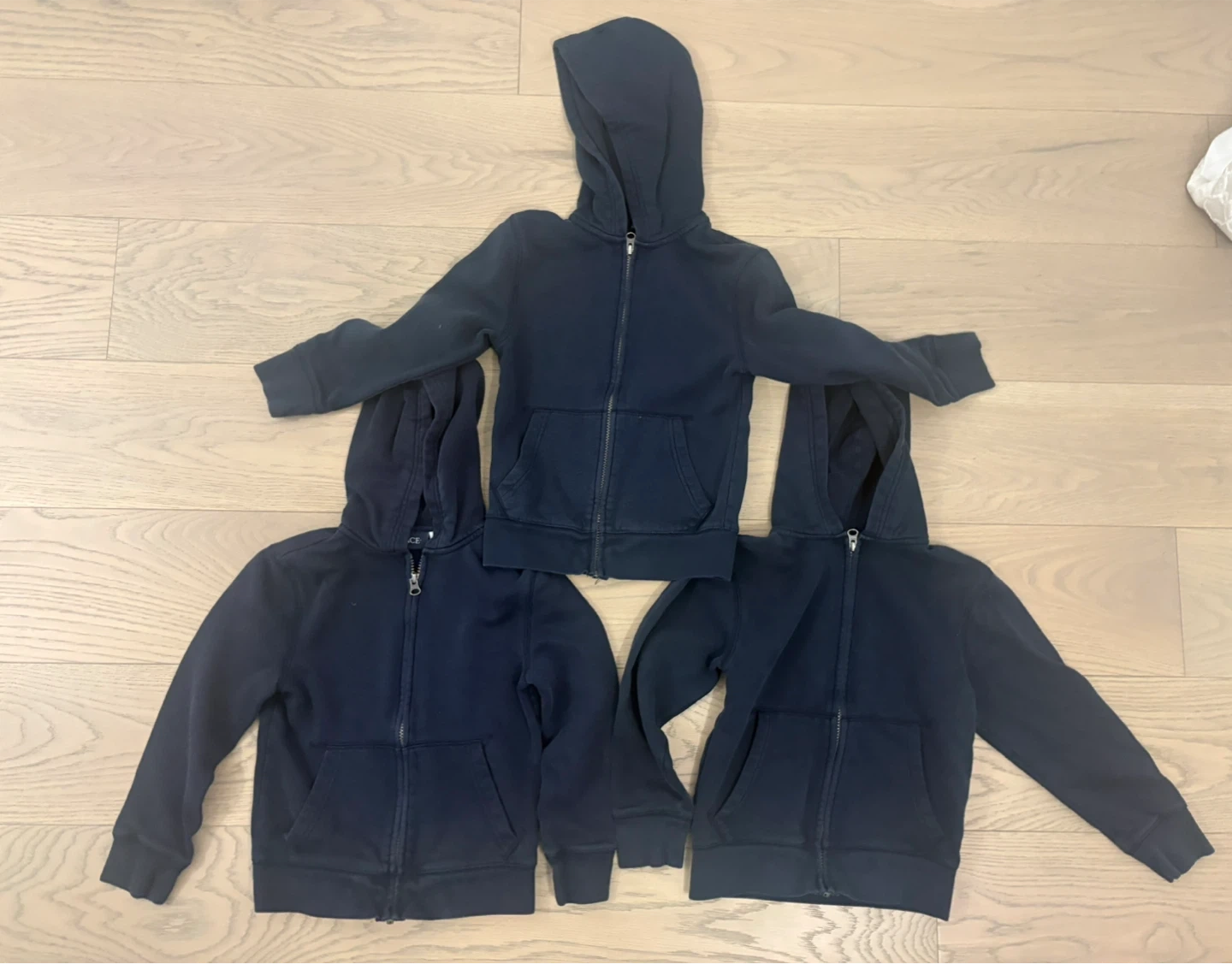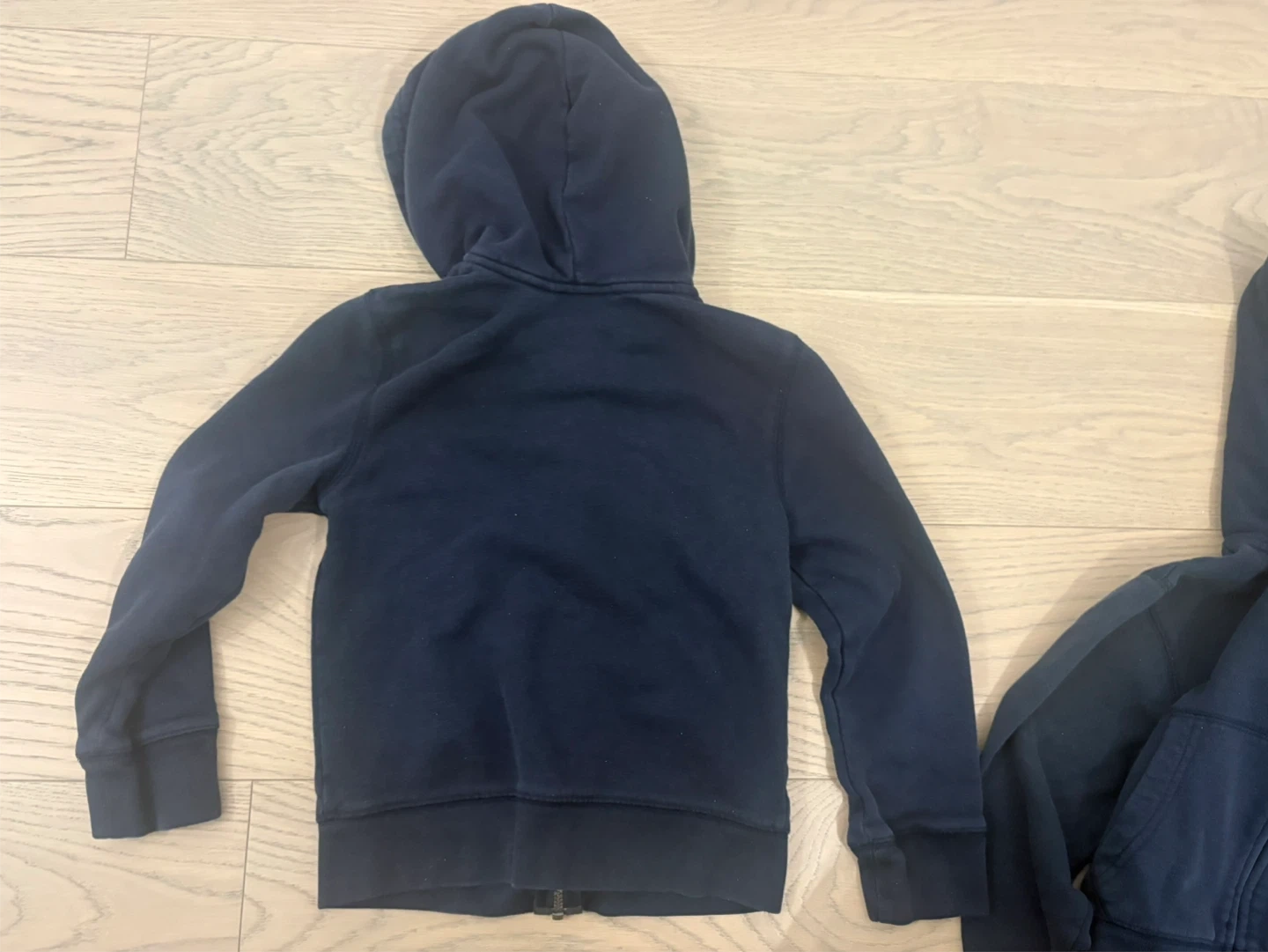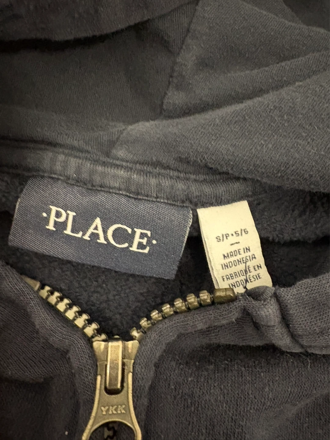 Three navy blue zip-up hoodies from The Place. Sizes are S/P 5/6. One hoodie has a tiny yellow spot on pocket.