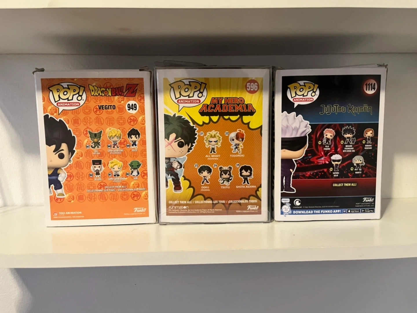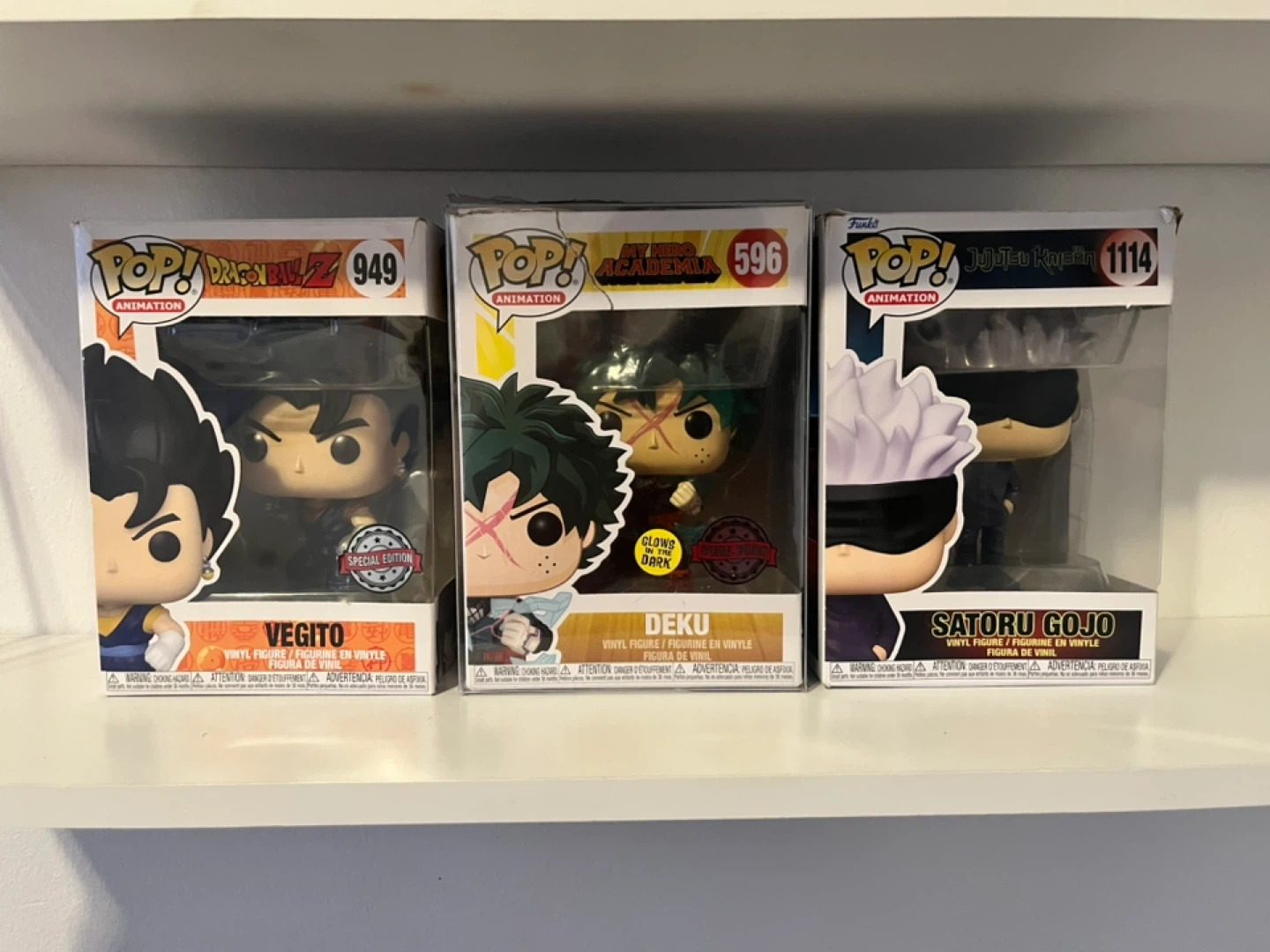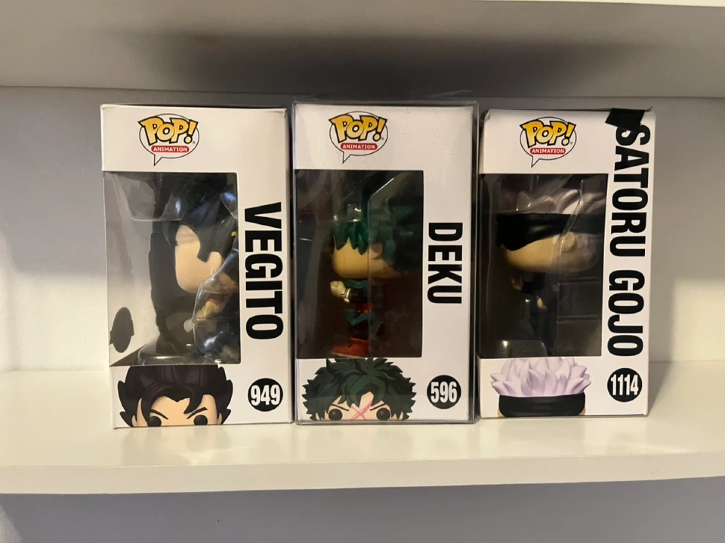 Three Funko Pop! Animation vinyl figures. Includes Dragon Ball Z Vegito (949), My Hero Academia Deku (596), and Jujutsu Kaisen Satoru Gojo (1114). All figures come in their original boxes.