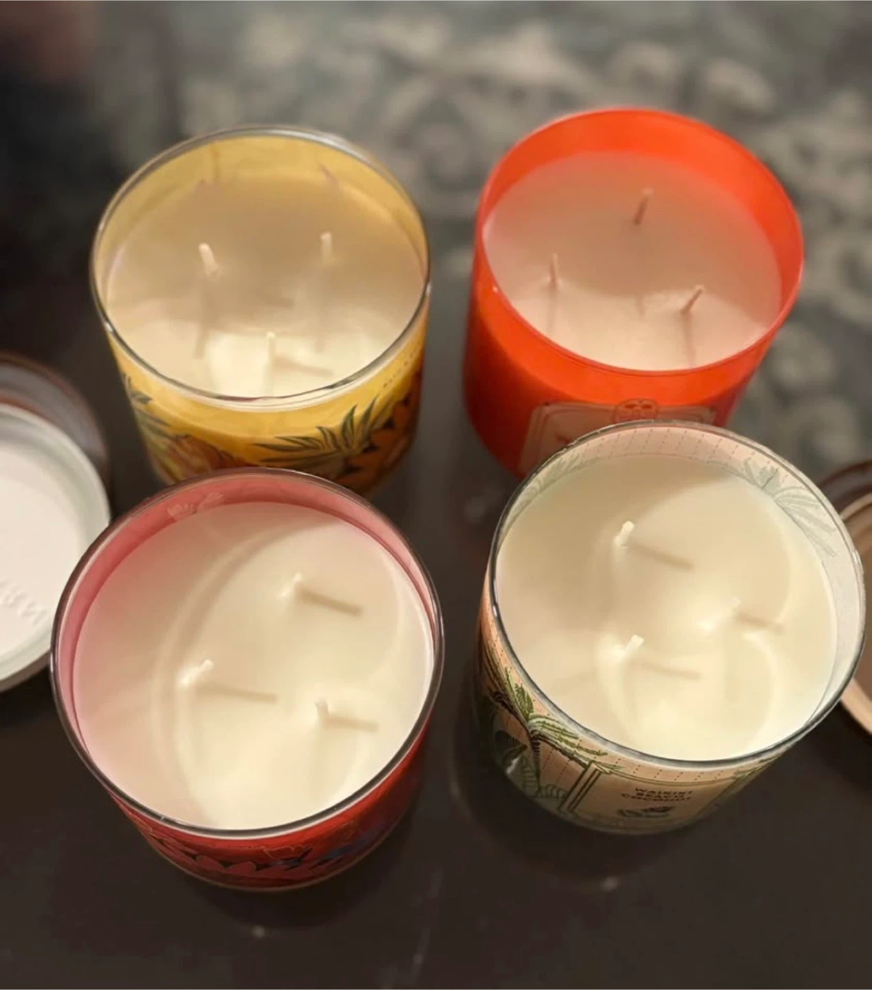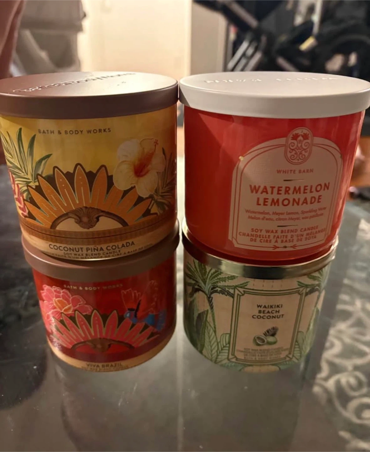 Four 3-wick soy wax blend candles from Bath & Body Works. Includes Coconut Piña Colada, Watermelon Lemonade, Viva Brazil, and Waikiki Beach Coconut scents. These candles have a burn time of 25-45 hours. Perfect for creating a cozy atmosphere in any room!