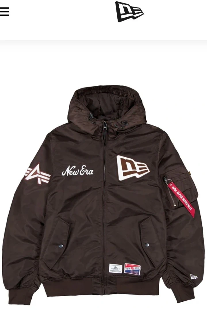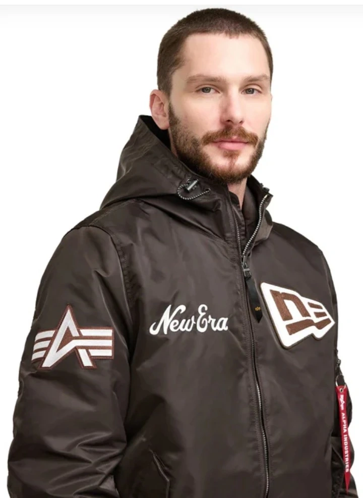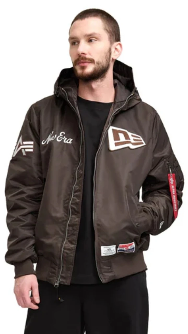 Check out this cool Alpha Industries bomber jacket in collaboration with New Era! It's a stylish brown color and features a hood for extra warmth. Perfect for adding a sporty touch to your outfit!