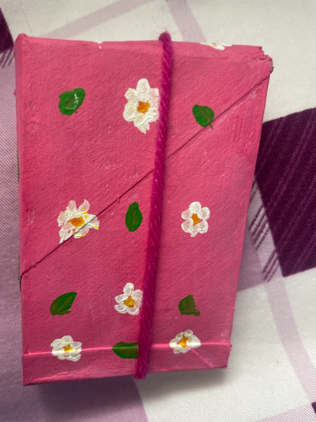 Pink cardboard box decorated with hand-painted white flowers and green leaves. Secured with bright pink yarn. Perfect for small gifts or storing trinkets!