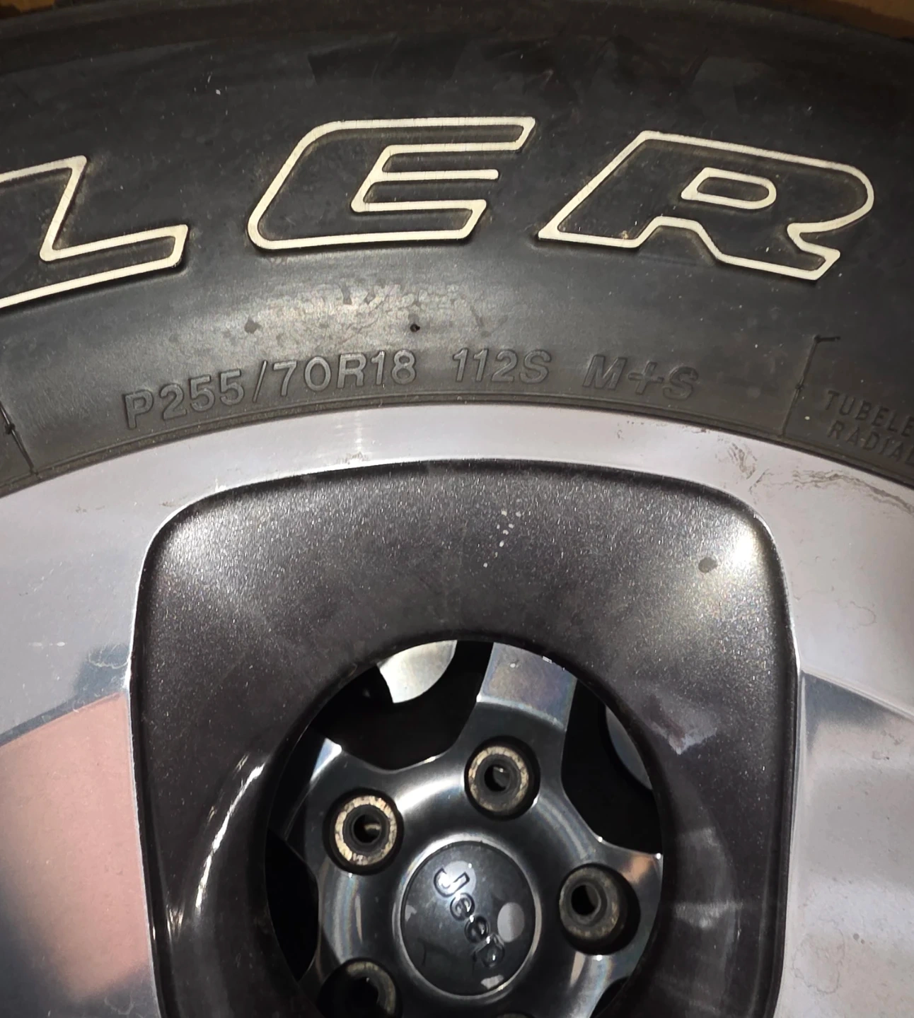 Set of Bridgestone Dueler A/T tires. Tire size is P255/70R18.will fit jeeps from 2017 through 2024 These are M+S rated tires.