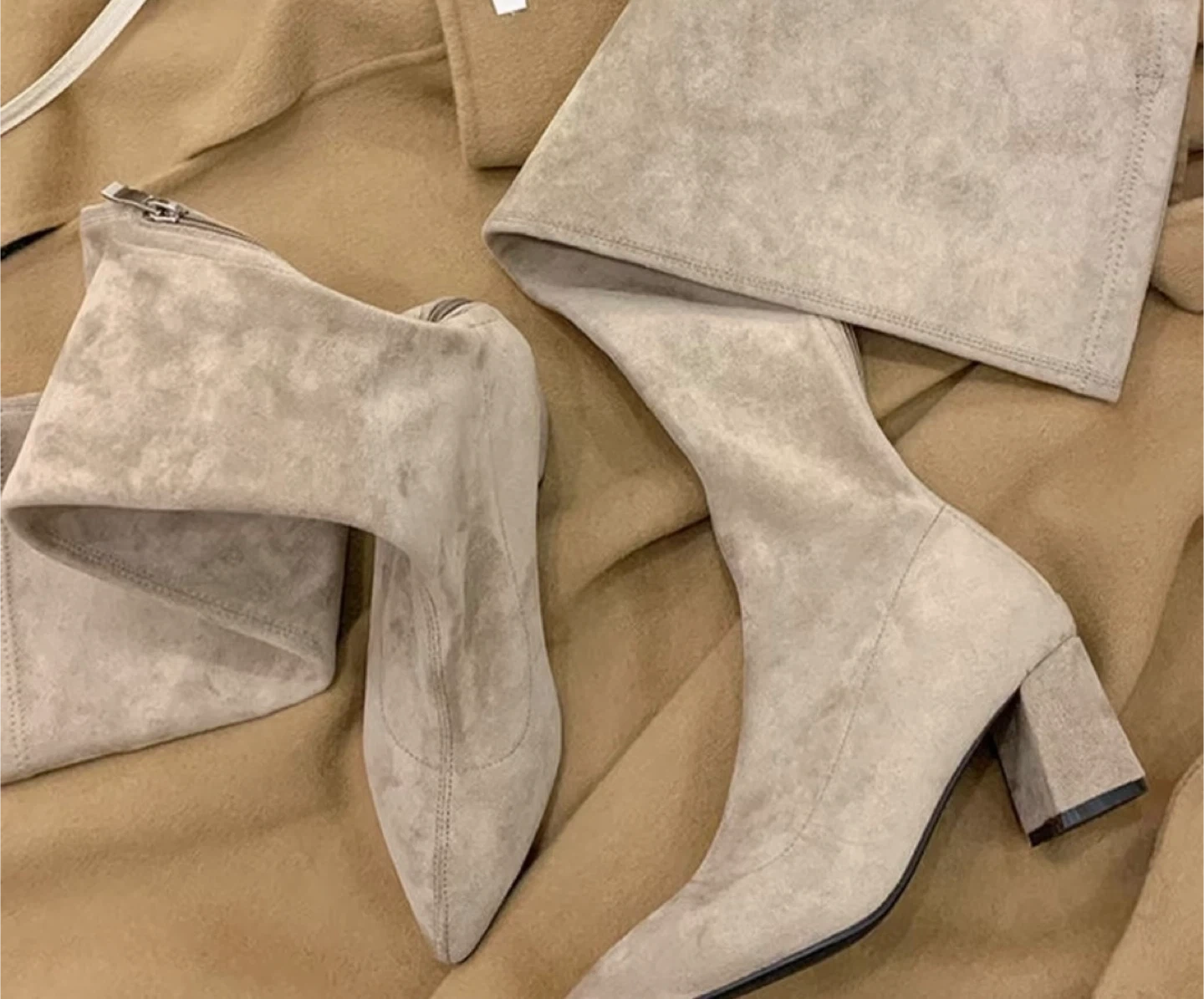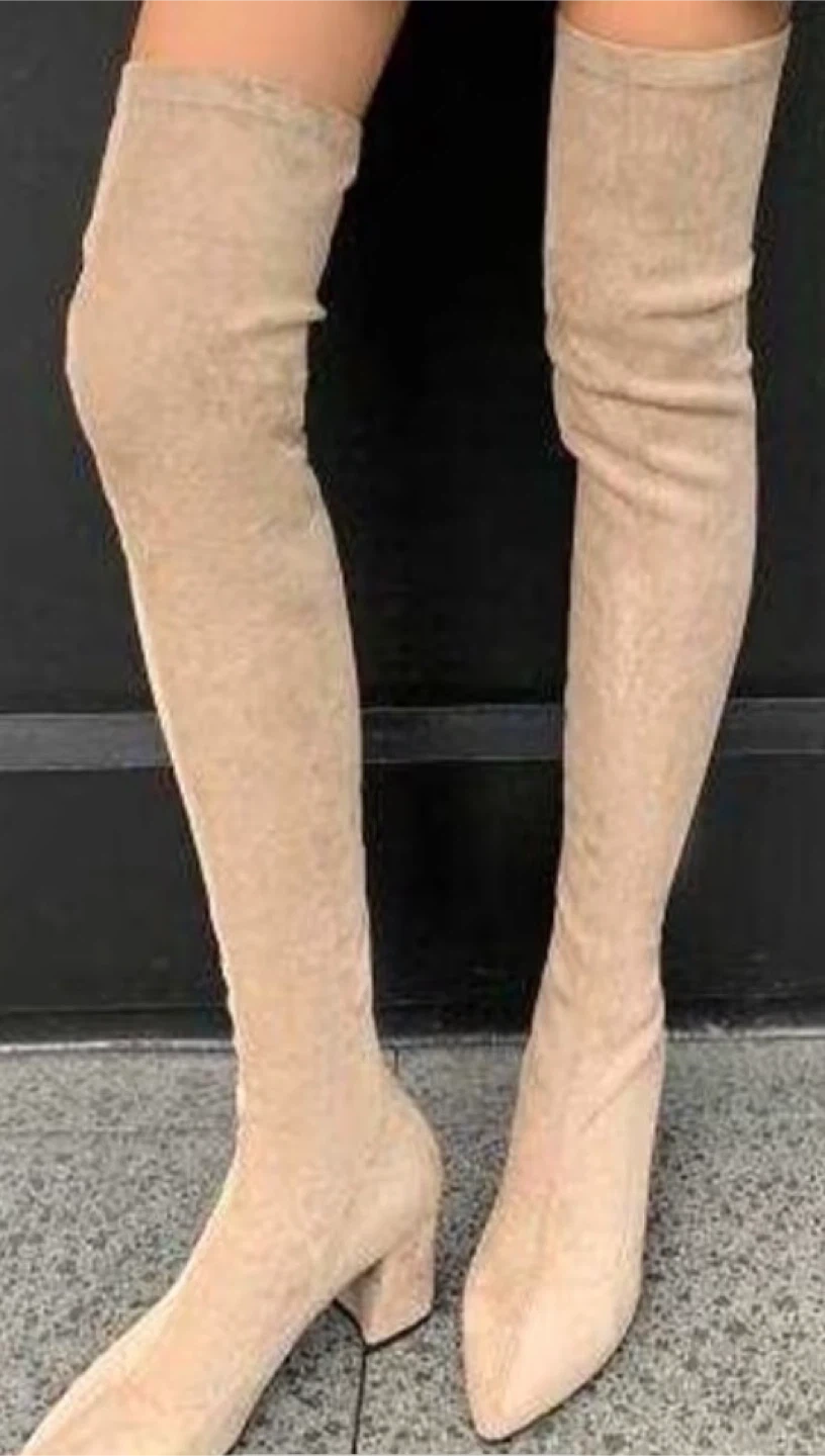 Beige over-the-knee boots in a faux suede material. These boots feature a pointed toe and a chunky block heel. They're perfect for adding a stylish touch to any outfit.