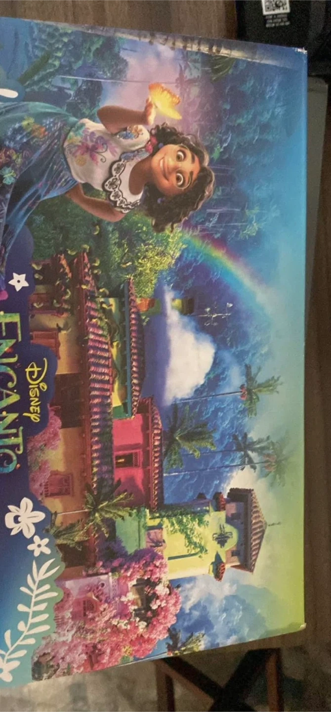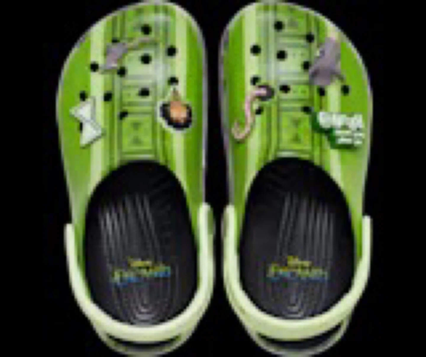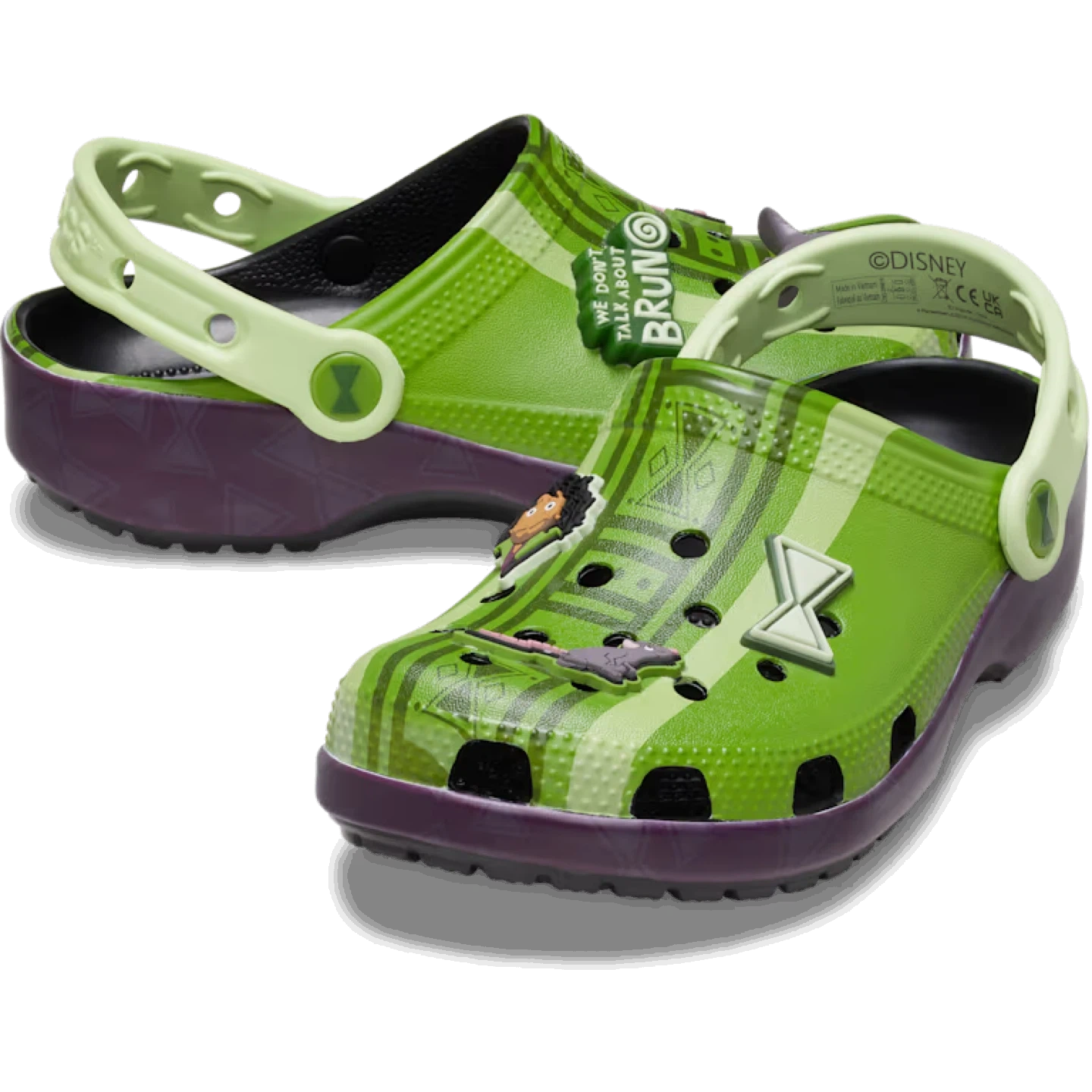 These are toddlers' Crocs featuring characters from Disney's Encanto. They come with Jibbitz charms of characters like Bruno. Green colour with a purple sole.