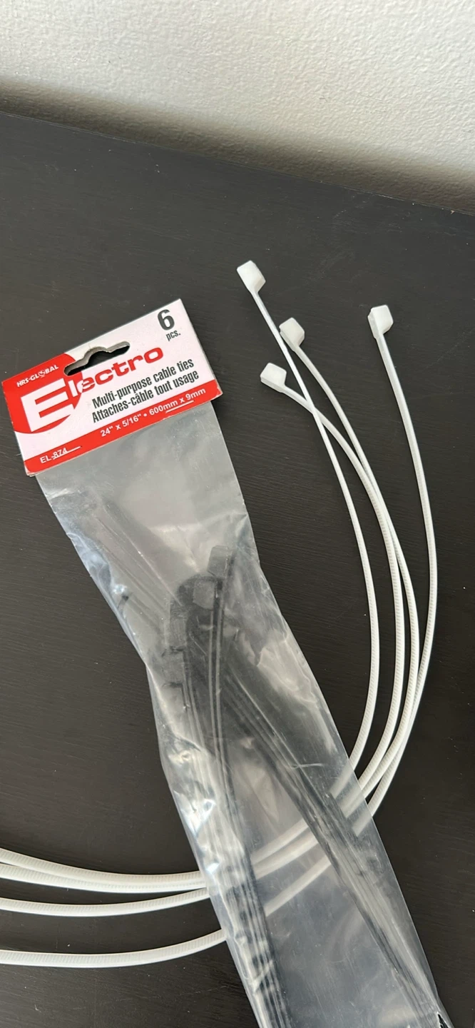 Electro multi-purpose cable ties. Includes 6 pieces. They're 24 inches by 5/16 inches, or 600mm by 9mm. These are great for organizing wires!
