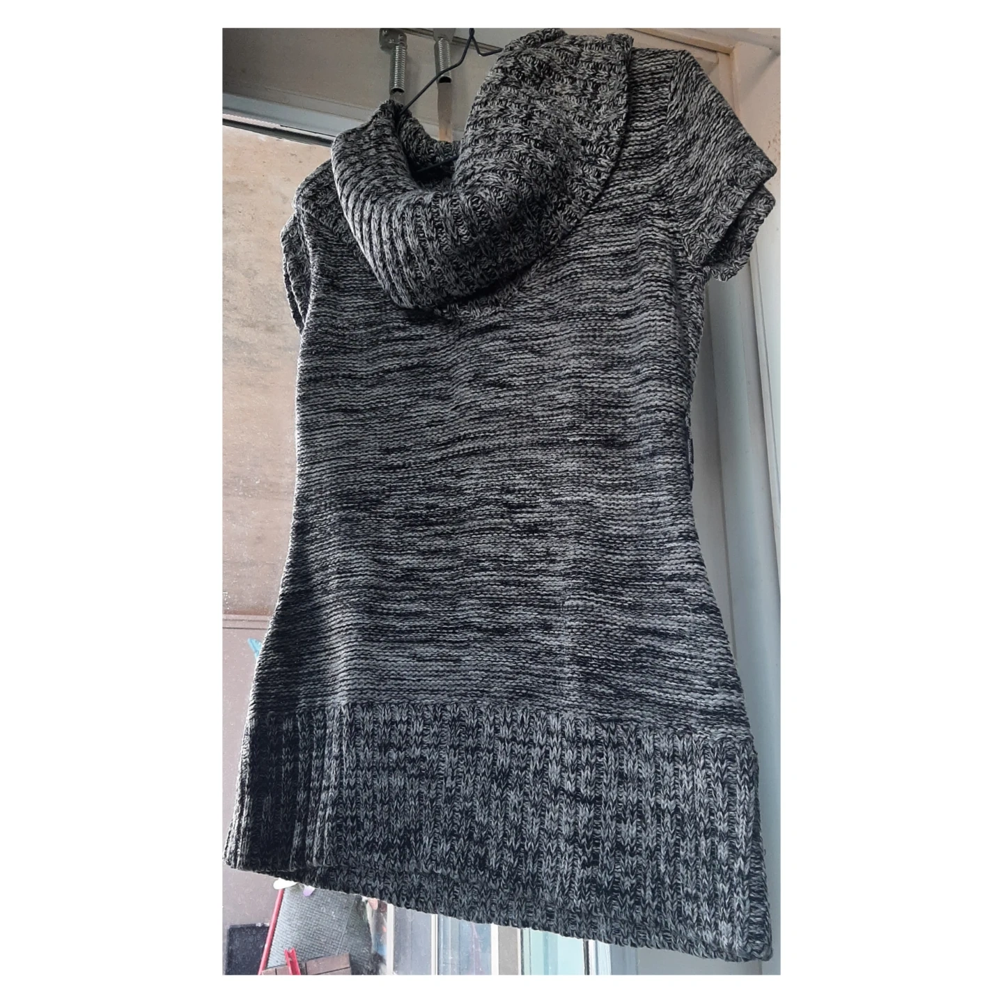 This is a women's short sleeve knit tunic sweater with a cowl neck. It features a marled grey and black knit pattern. Belt not included ,the sweater's material is a blend of acrylic and polyester, offering warmth and comfort.