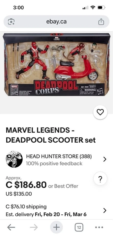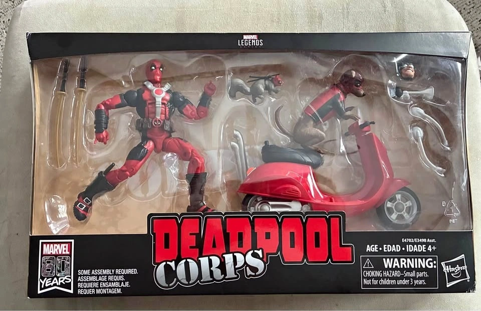 This is a Marvel Legends Ultimate Riders Deadpool Corps with Scooter action figure set. It is a 6-inch scale collectible set. The set includes action figures of Deadpool, Dogpool, and Squirrelpool, along with a scooter and Bob's head accessory. It was released as part of the Marvel Comics 80th Anniversary celebration. The figures are highly articulated and designed to resemble the characters from the comics. The manufacturer is Hasbro. Sells on eBay for over $100 (see attached photo).