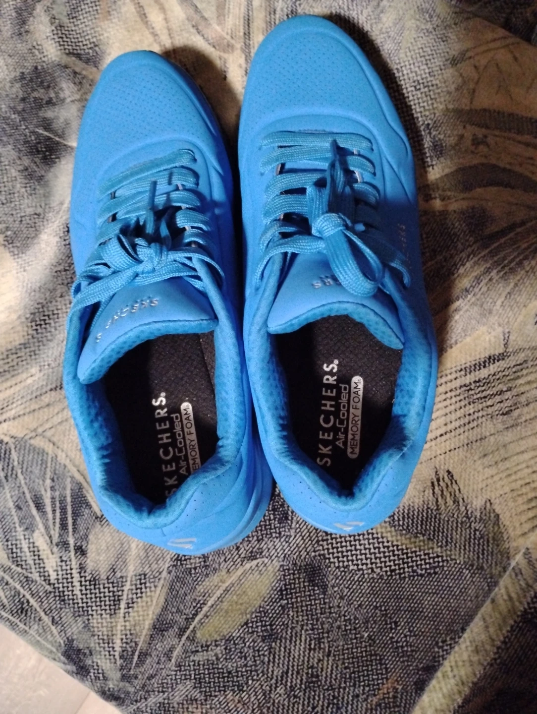 These bright blue Skechers athletic shoes feature air-cooled memory foam insoles for comfort. The rubber soles offer good traction. They're great for everyday wear or light activity.