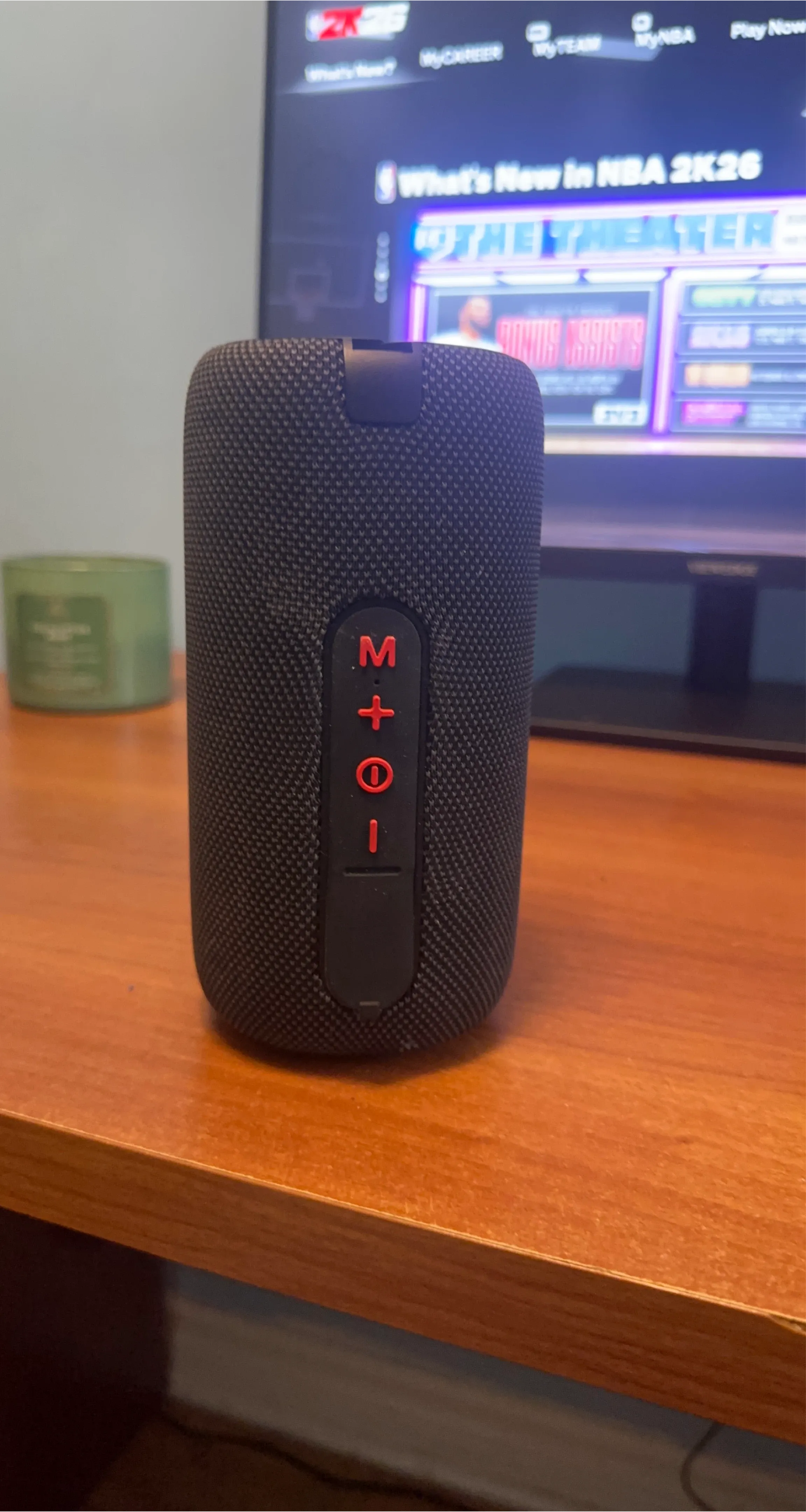 This is a black portable Bluetooth speaker. It's a compact size for easy carrying. The speaker has buttons for volume control and power.