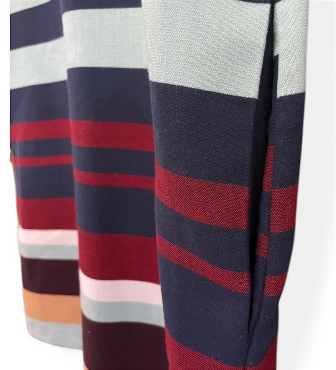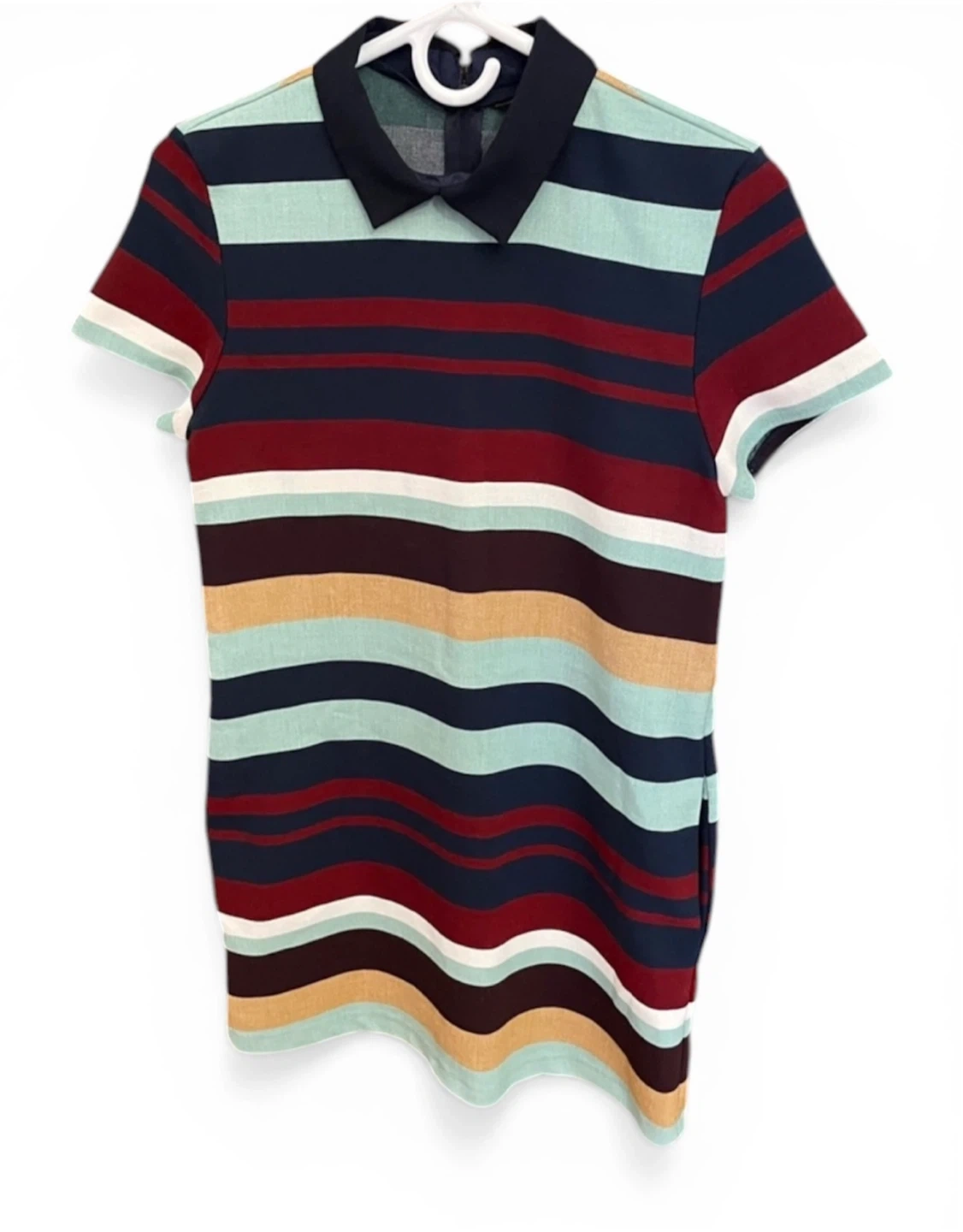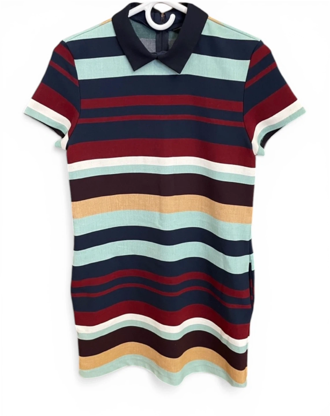 ZARA Trafaluc collection, shift-style mini dress with horizontal stripes in multiple colors including: burgundy, navy, light blue, and tan.