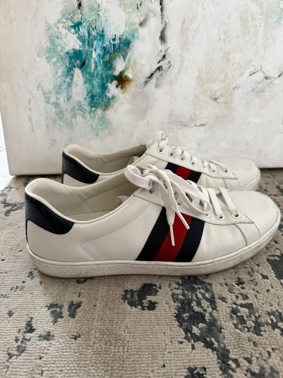 Classic white leather sneakers from Gucci. Features the iconic red and blue stripe detail on the side and navy accent at the heel. Lace-up closure for a secure fit. These are a stylish addition to any casual outfit!