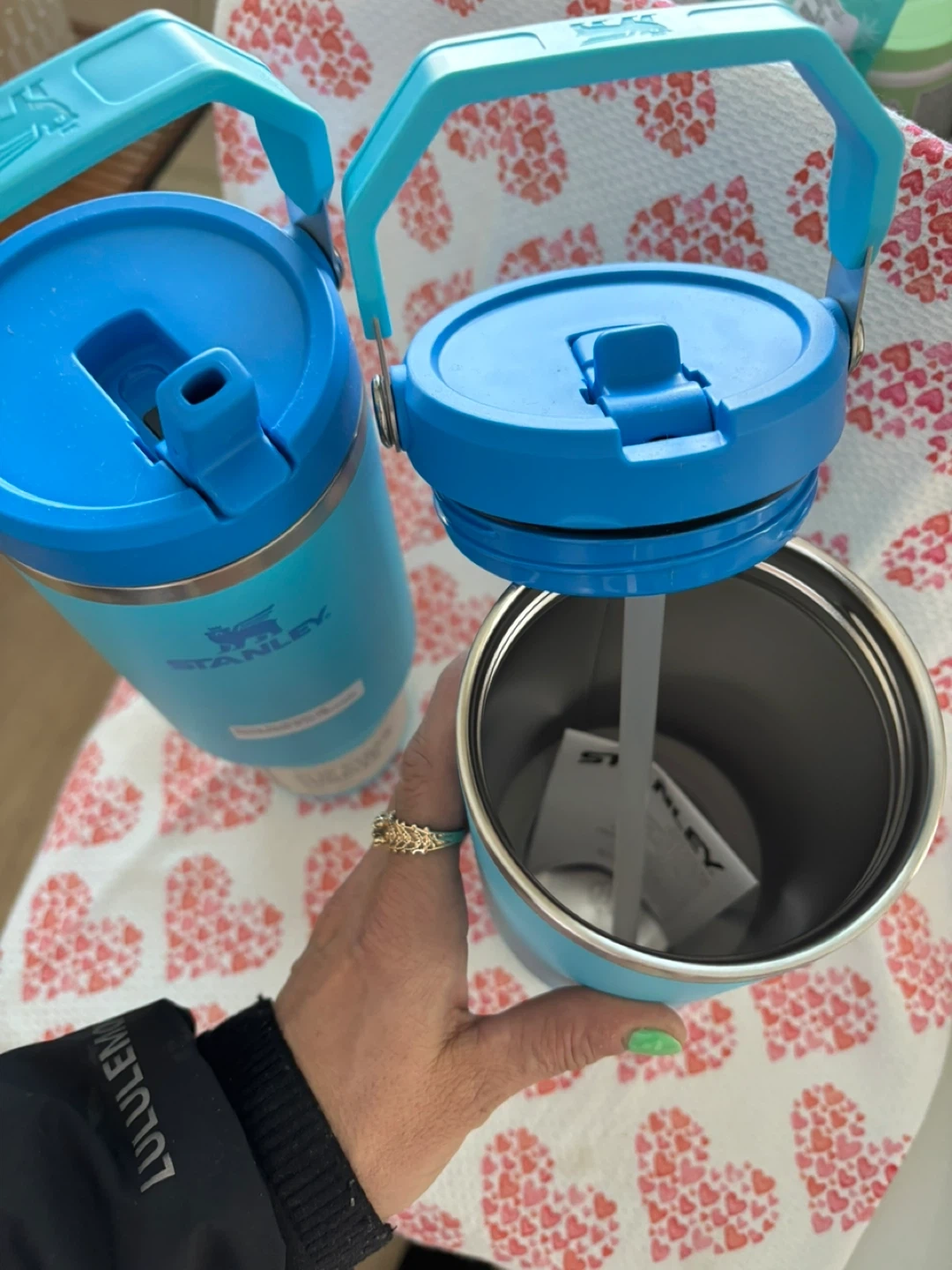 Two Stanley IceFlow Flip Straw Tumblers included. They hold 40 oz (1.18 L) each and are designed for active hydration. These tumblers are great for keeping drinks cold on the go!