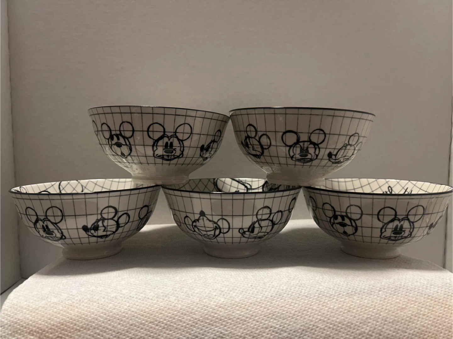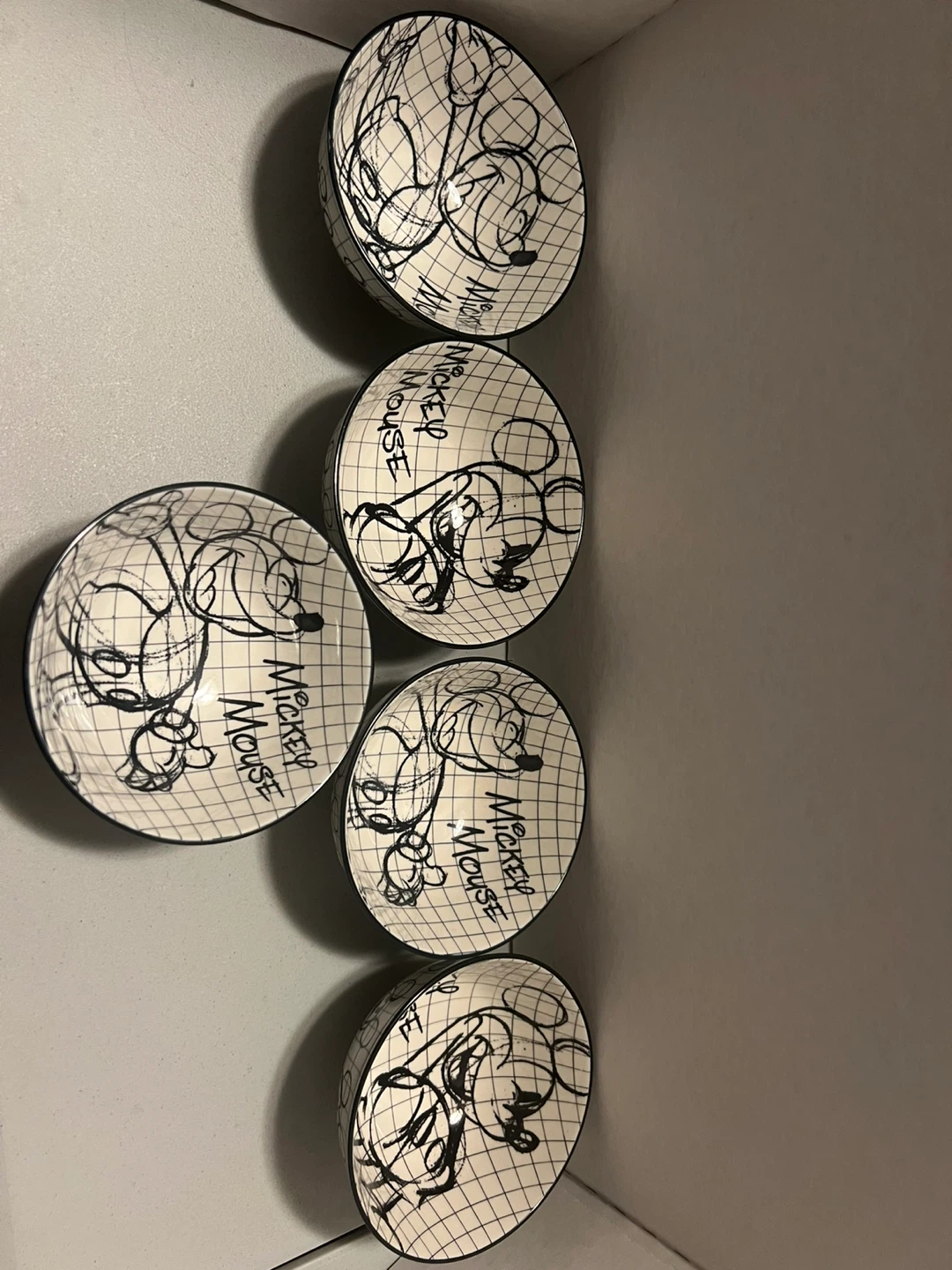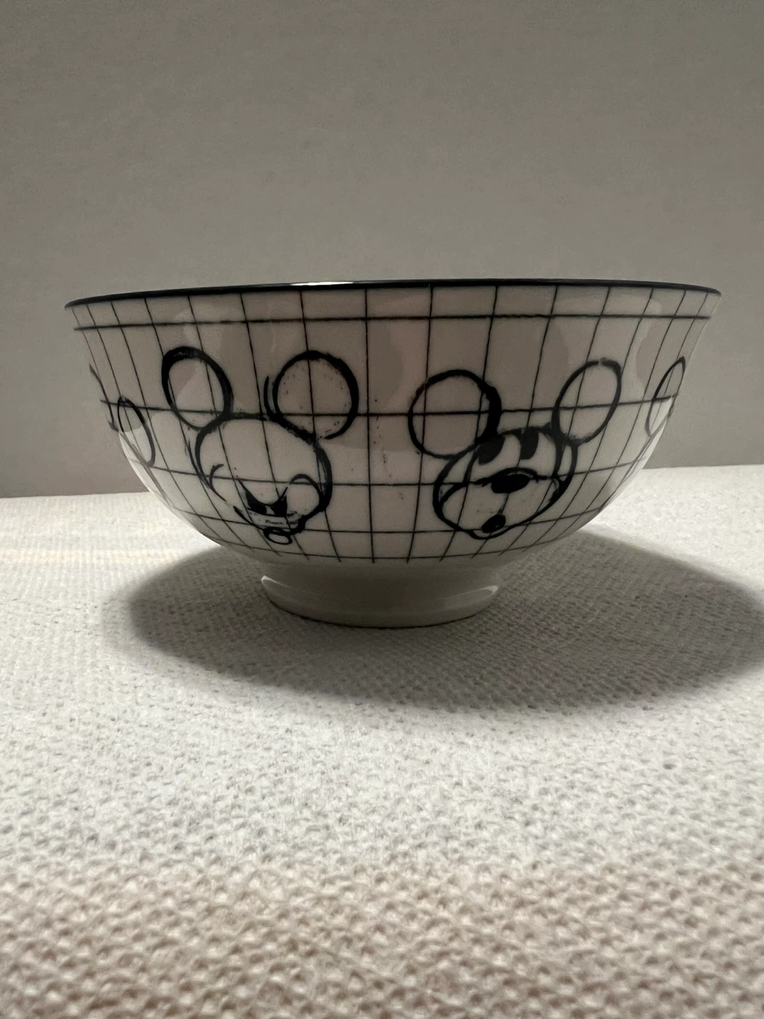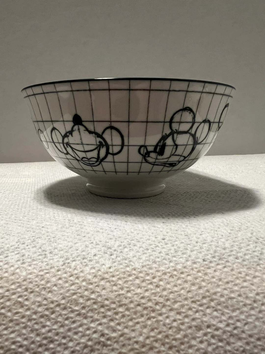 •Design: These are black and white ceramic bowls featuring various sketch-style images of Mickey Mouse, including a laughing Mickey Mouse inside each of the bowls.