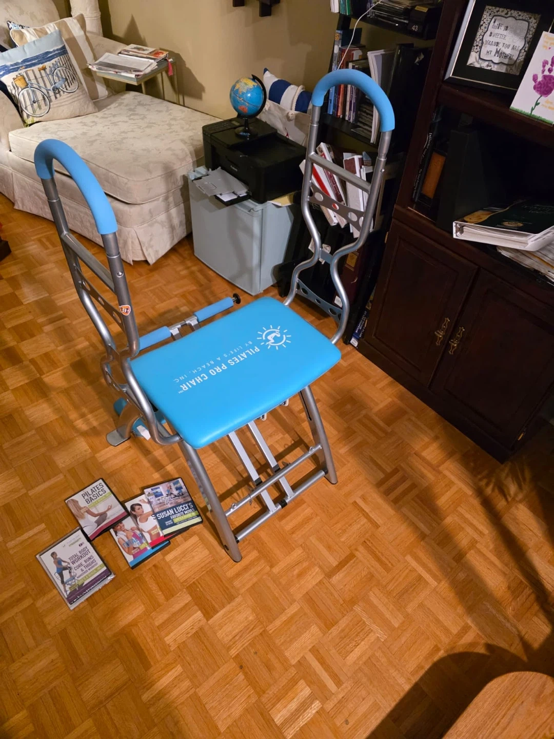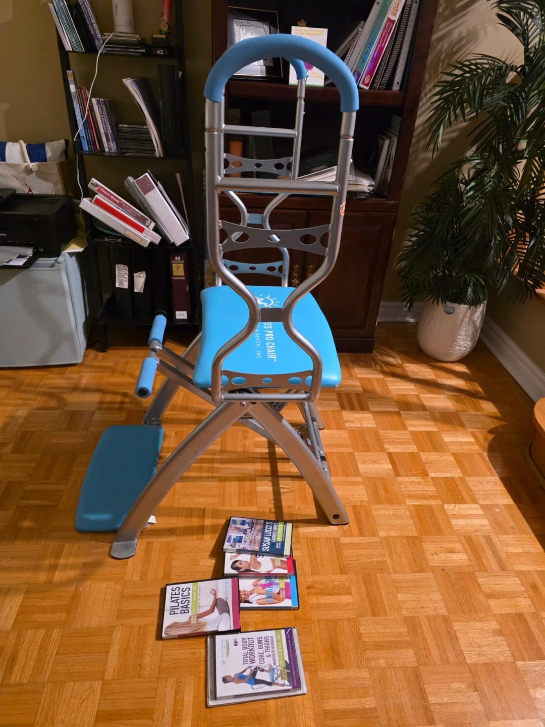 This Pilates Pro Chair is in good condition and comes with four workout DVDs: Pilates Basics, Total Body Workout & Thighs, and two others. It's a compact and effective piece of exercise equipment for home use. A great way to get a full-body workout without leaving your house!