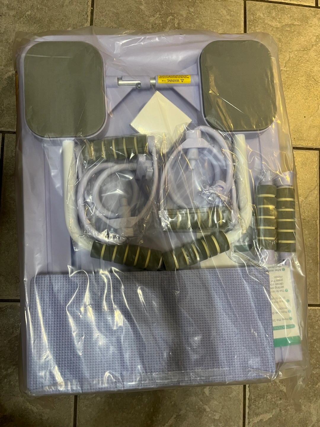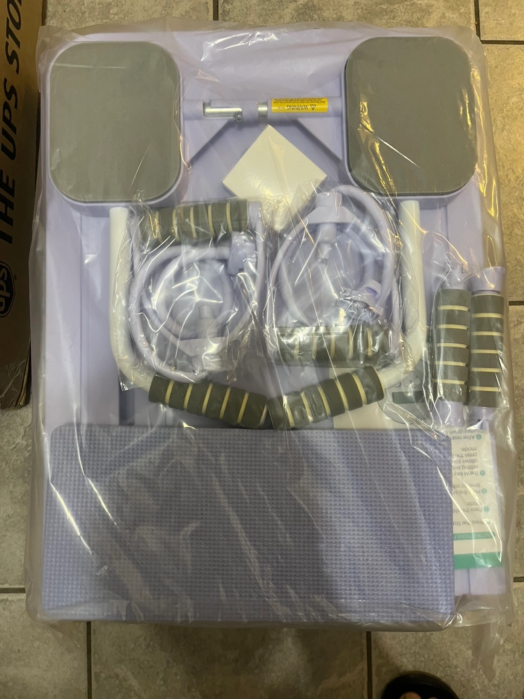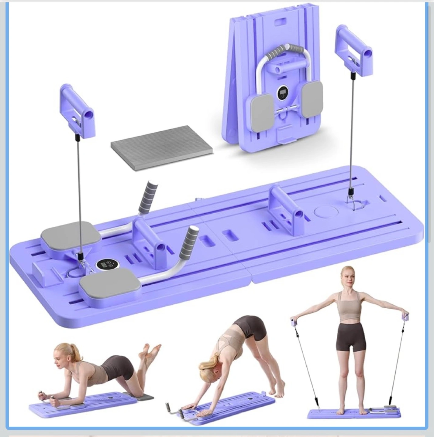 Lavender Pilates board, folds for easy storage. Includes resistance bands and push-up stand. Great for core, abs, and full body workouts. Non-slip mat. 42 inch extended silent rail. Supports up to 330 lbs.