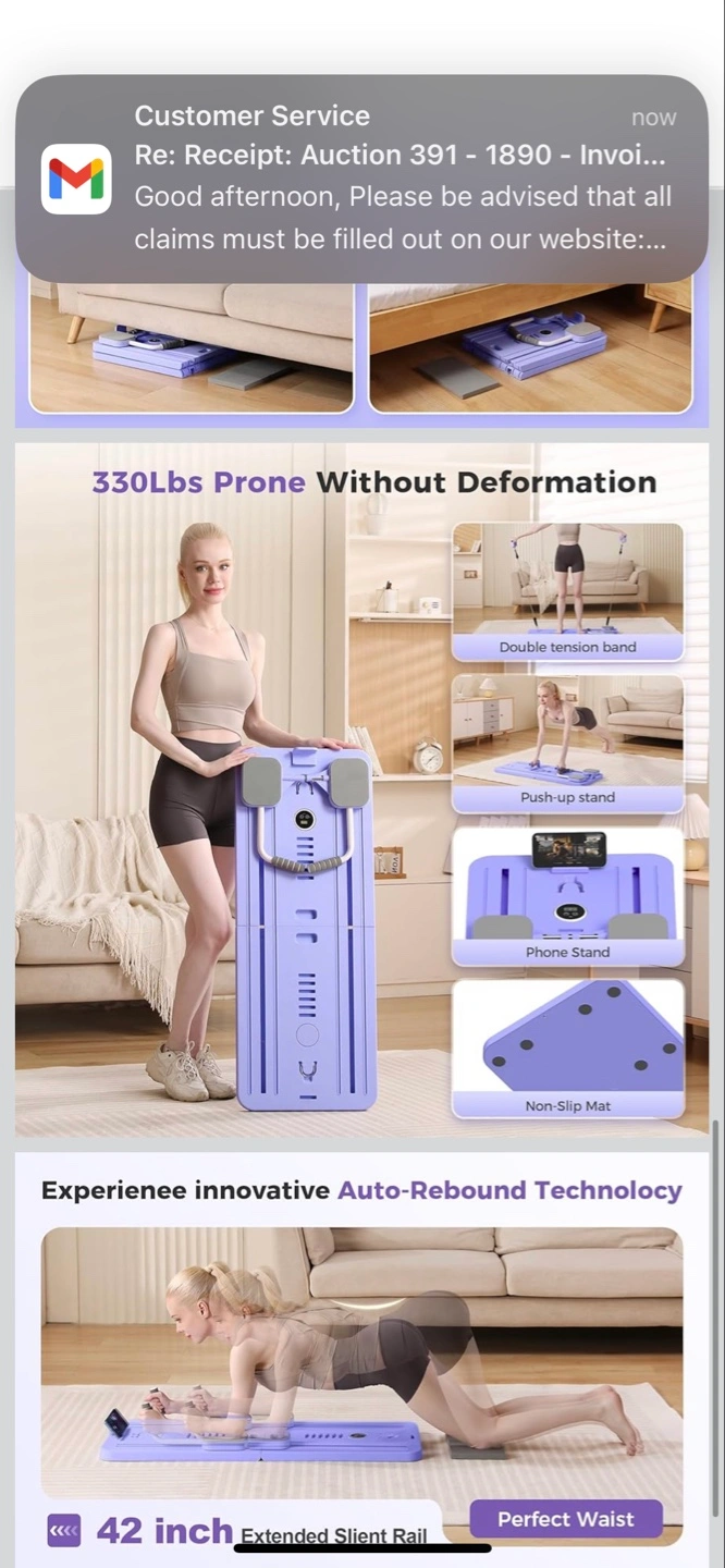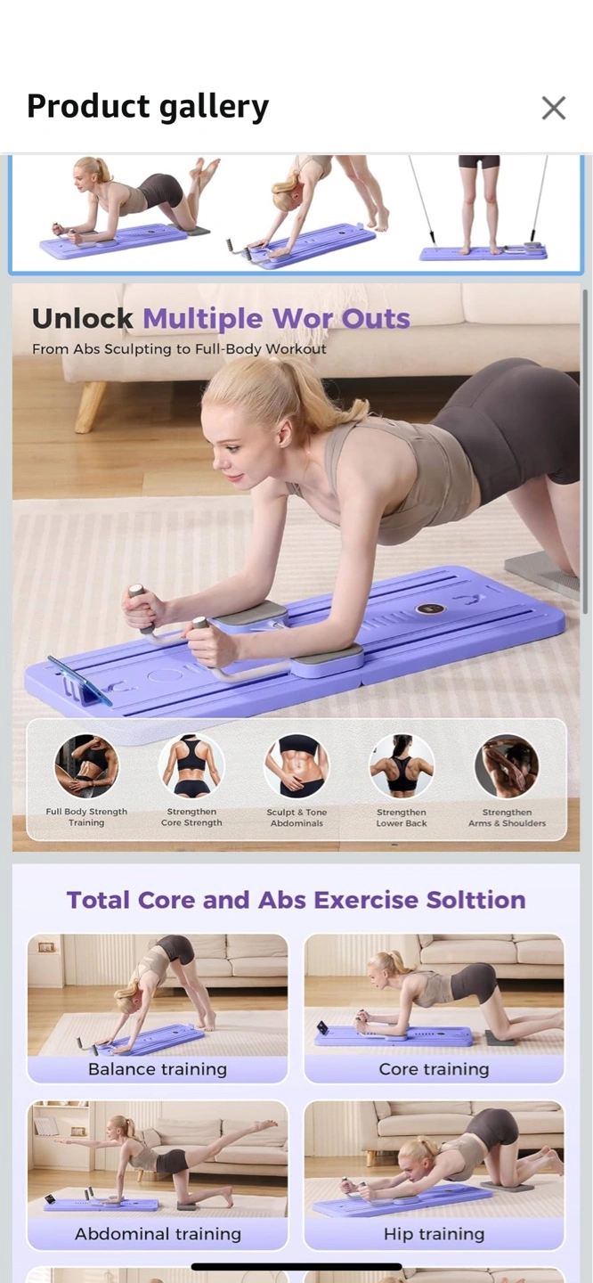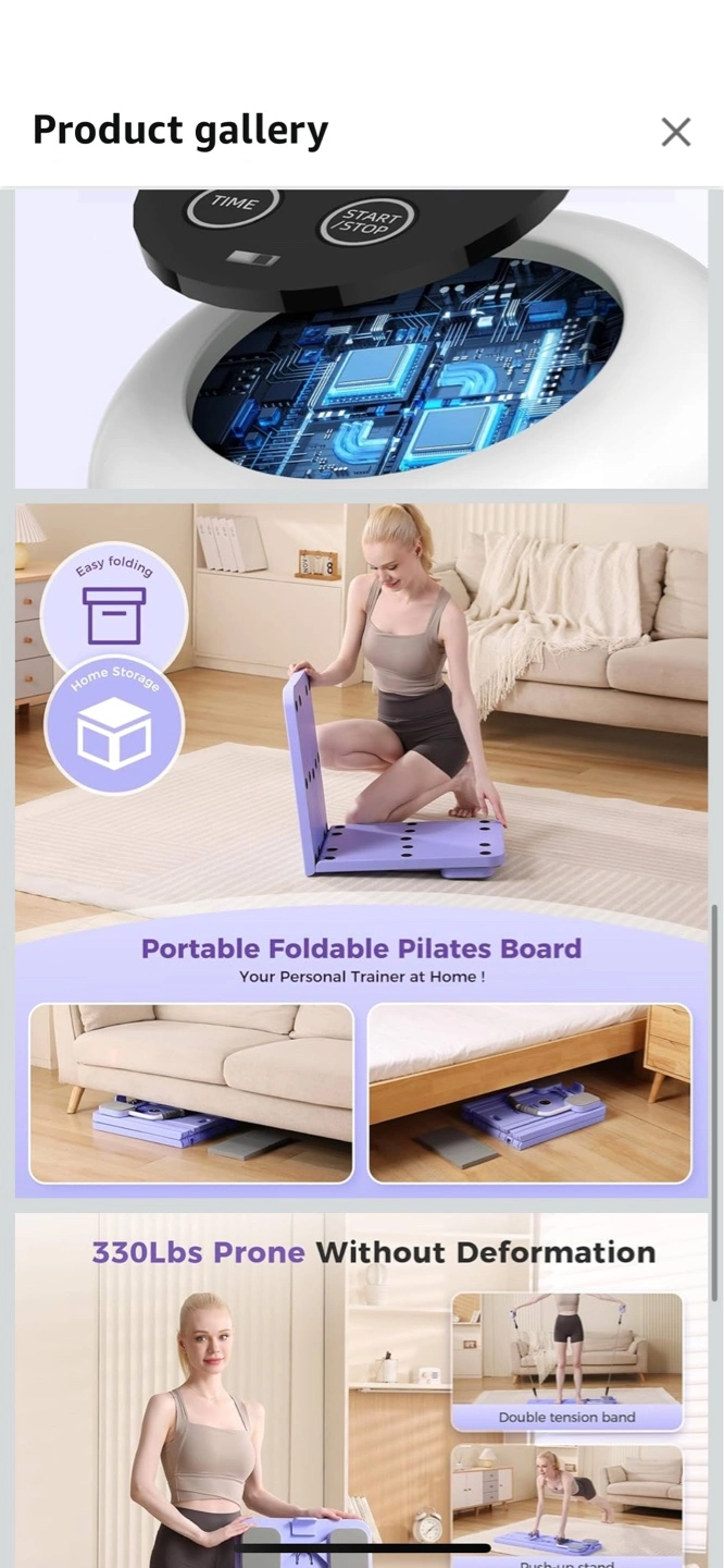 Lavender Pilates board, folds for easy storage. Includes resistance bands and push-up stand. Great for core, abs, and full body workouts. Non-slip mat. 42 inch extended silent rail. Supports up to 330 lbs.