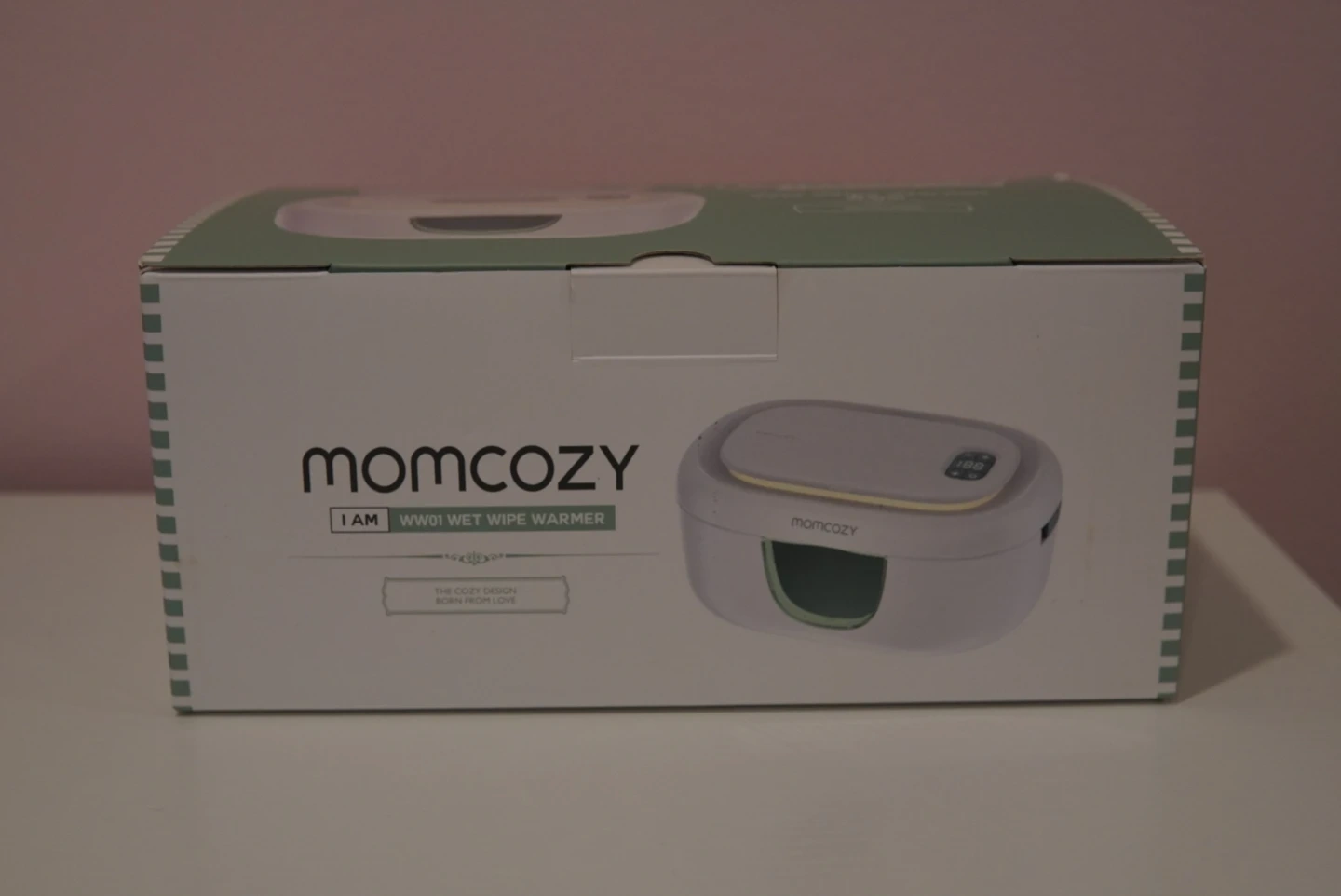Momcozy WW01 wet wipe warmer. It features a cozy design born from love. The warmer has a display and night light