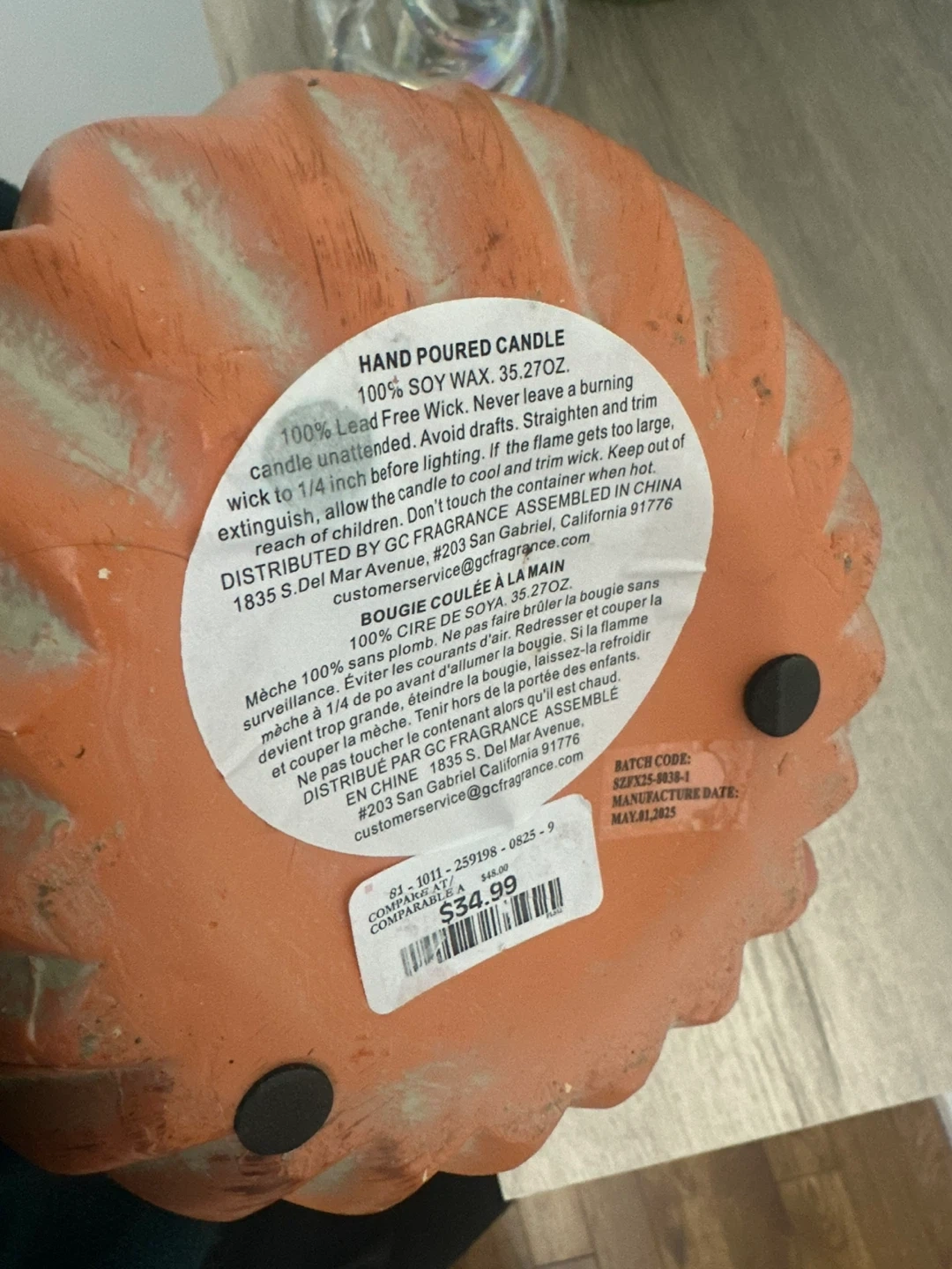 109Selling a cute MG Studio Vanilla Pumpkin candle! It's a hand-poured candle made with 100% soy wax, weighing 35.27oz. The original price was $34.99. The manufacture date is May 01, 2023