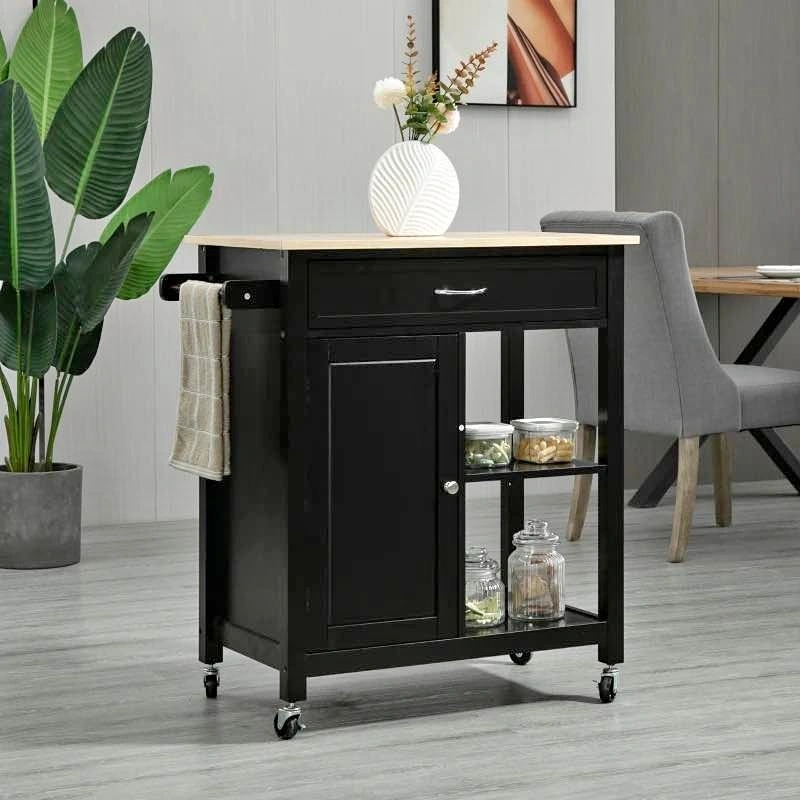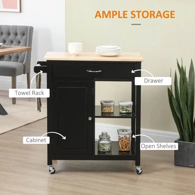 Brand new assembled rolling kitchen cart with a wood top and drawer. This kitchen island on wheels is perfect for your dining room. Black color.