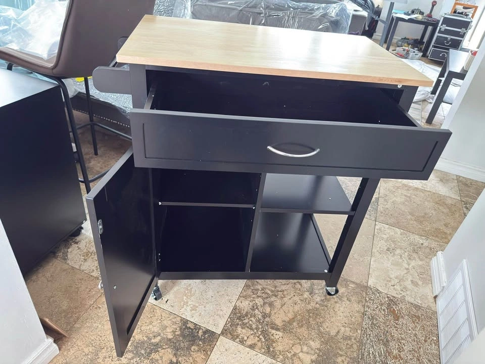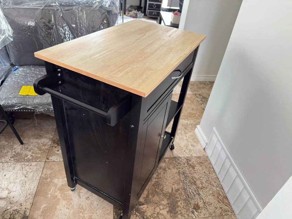 Brand new assembled rolling kitchen cart with a wood top and drawer. This kitchen island on wheels is perfect for your dining room. Black color.