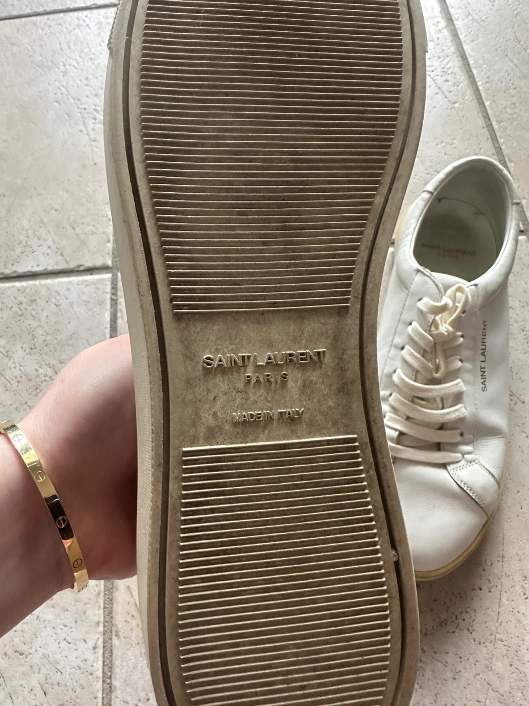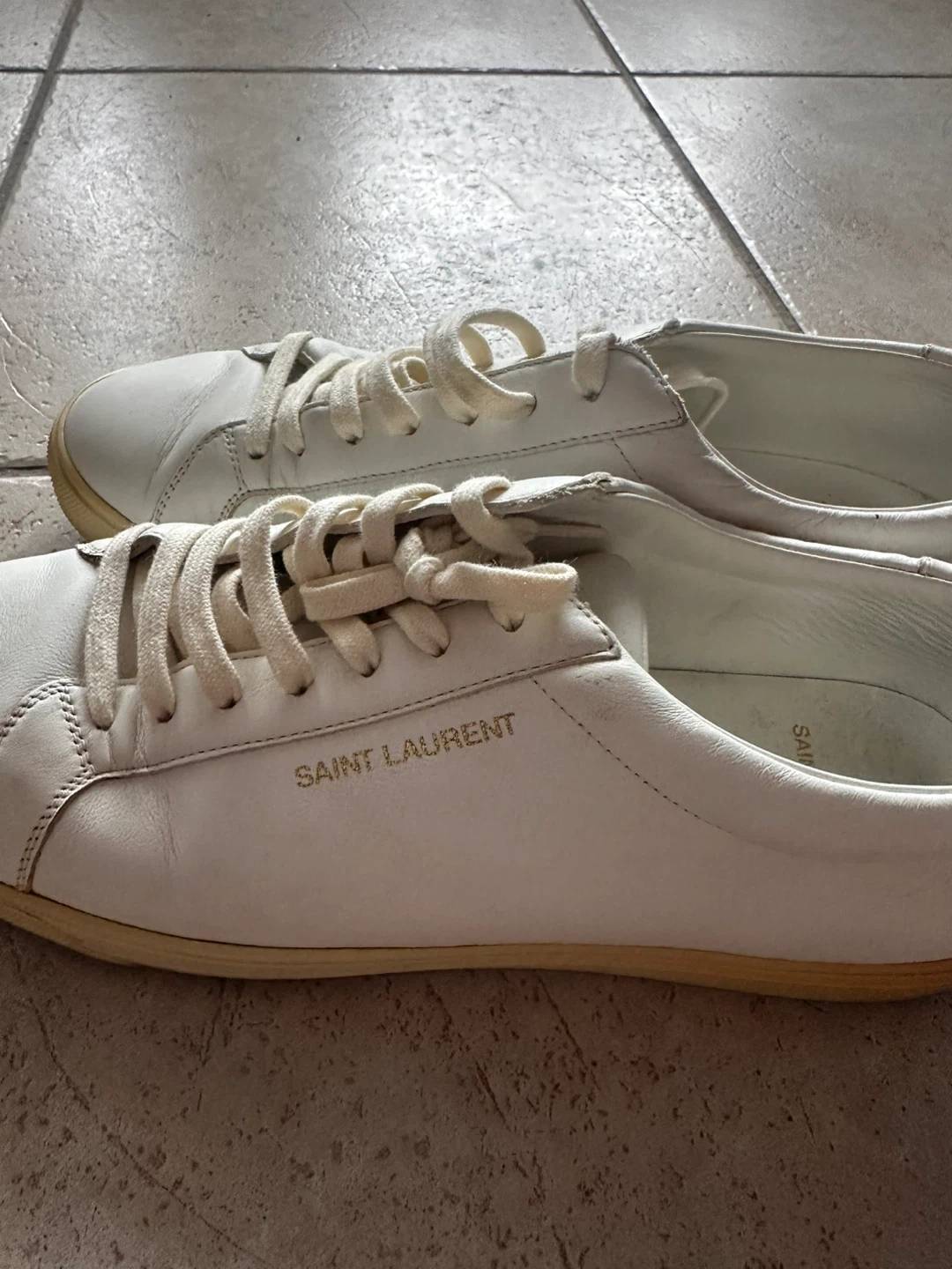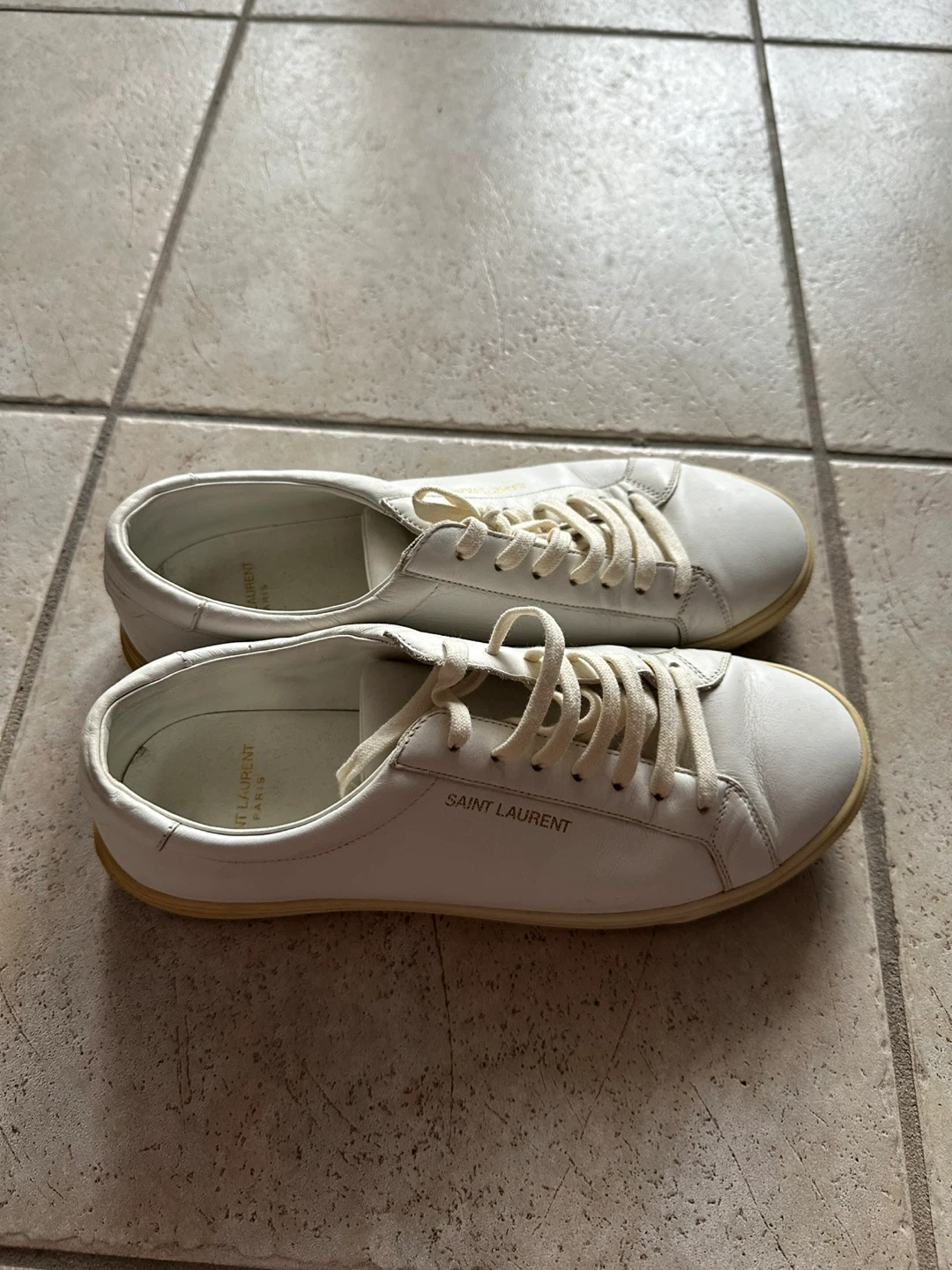 Classic white leather Saint Laurent Paris sneakers. Made in Italy. These stylish kicks are perfect for everyday wear.