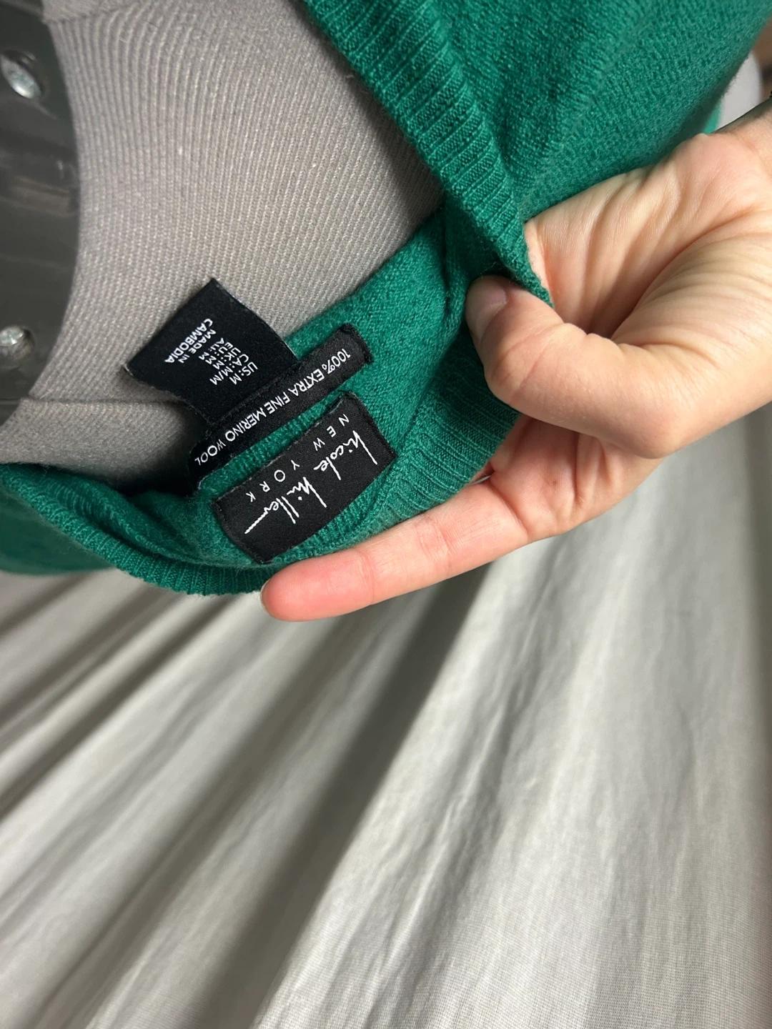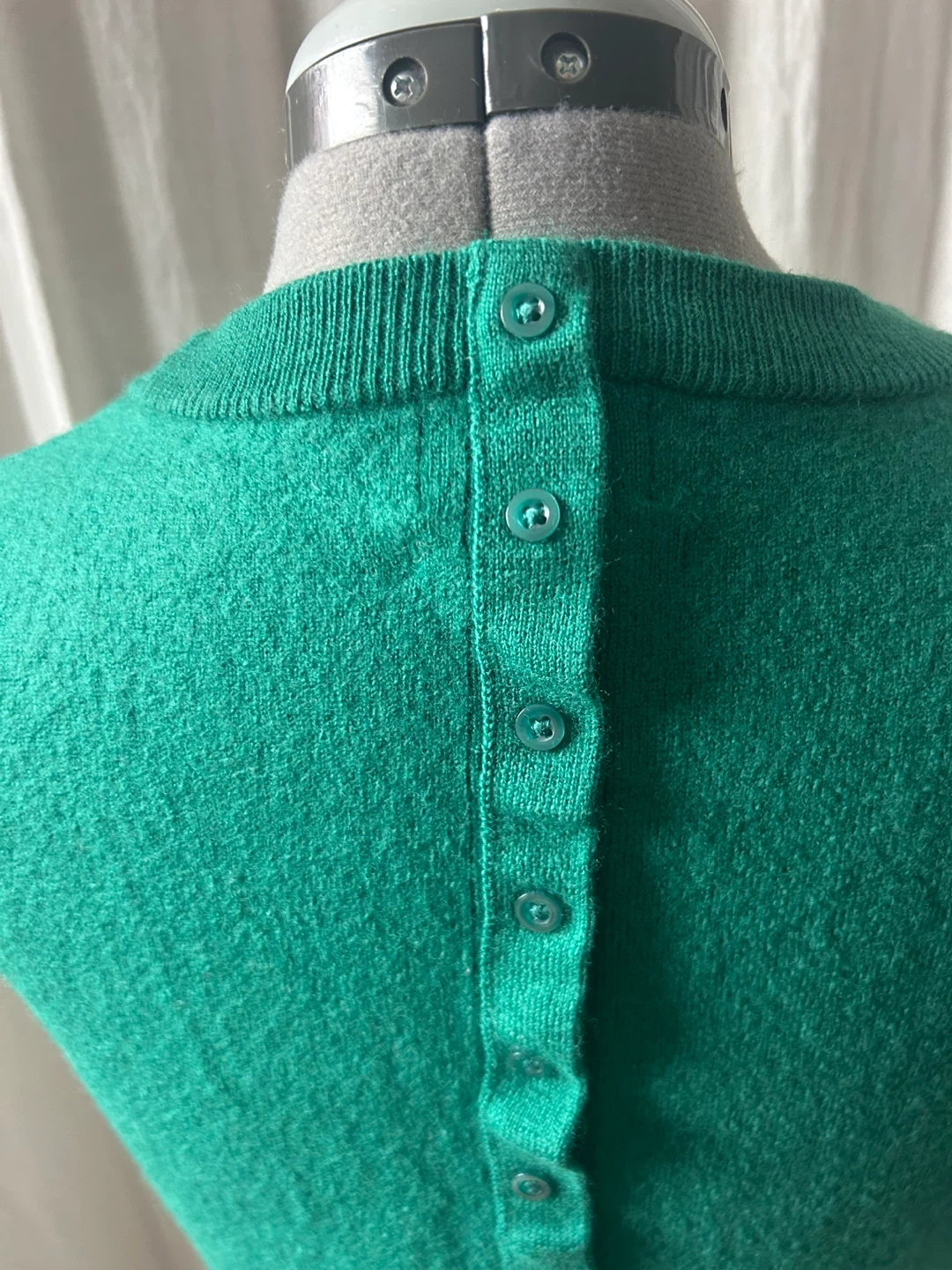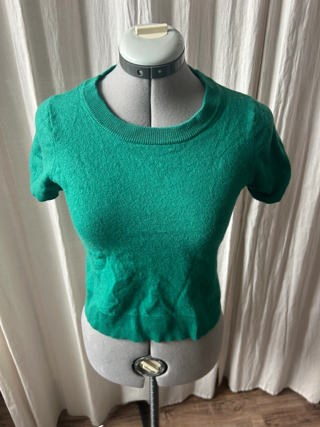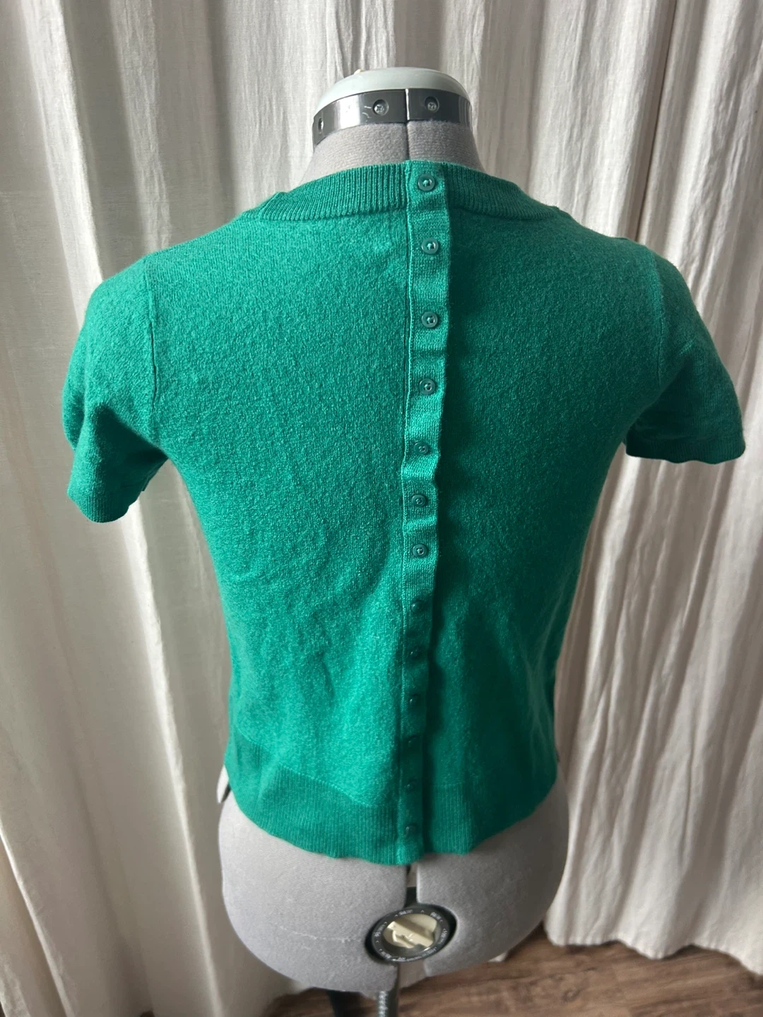 Short-sleeve sweater top in a vibrant green. Made from 100% extra-fine merino wool. Fits like a S. It has a button-up back closure for a unique touch. I am moving back to Australia so can’t take everything with me, take a look at my other listings!
