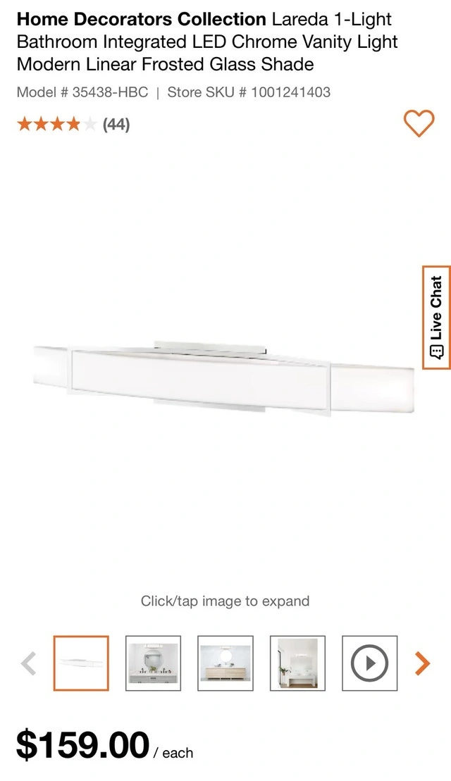 Add a touch of modern elegance to your bathroom with this Home Decorators Collection Lareda 1-Light Integrated LED vanity light fixture. This fixture features a sleek chrome finish and a modern linear design with a frosted glass shade. It provides ample lighting for your vanity area. Brand: Home Decorators Collection, Model: Lareda, Light Type: Integrated LED, Finish: Chrome, Shade: Frosted Glass. If you're seeing this ad, then yes, it's still up for grabs!