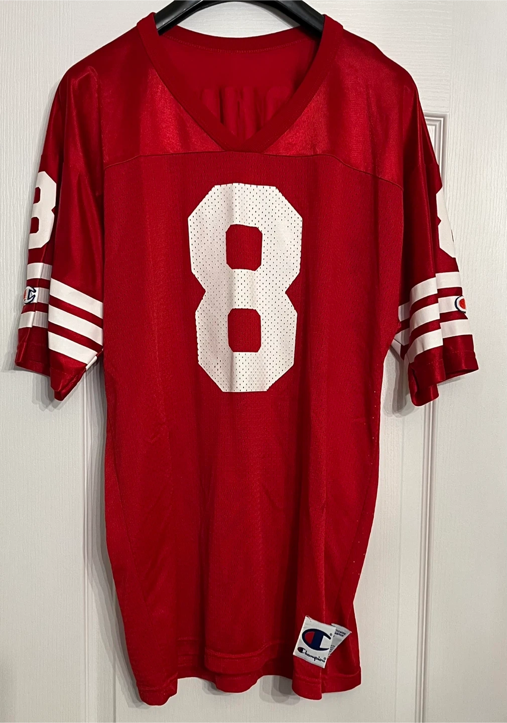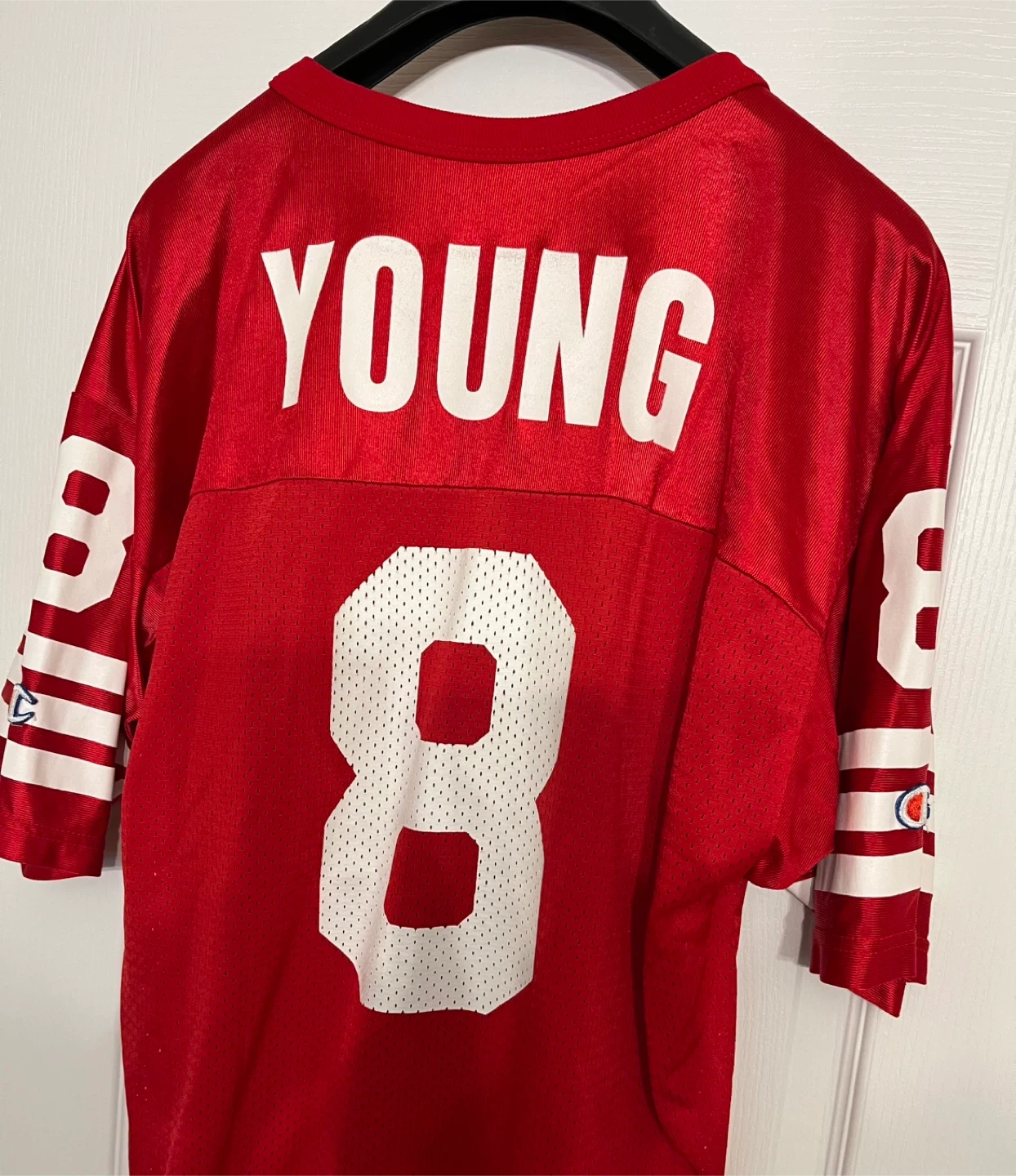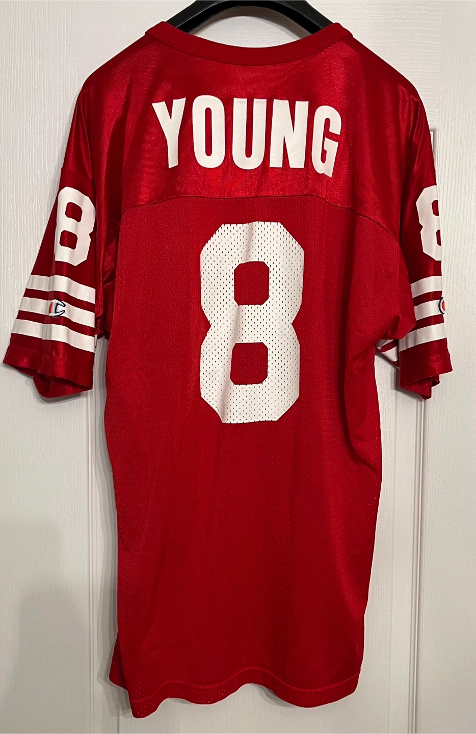 Vintage San Francisco 49ers Champion Steve Young jersey in size 44 (Men’s size Large) The jersey is red and features the number 8 on the front and back, along with "YOUNG" on the back. It also has the Champion logo on the sleeves and bottom front. A great Vintage piece for any 49ers football fan!
