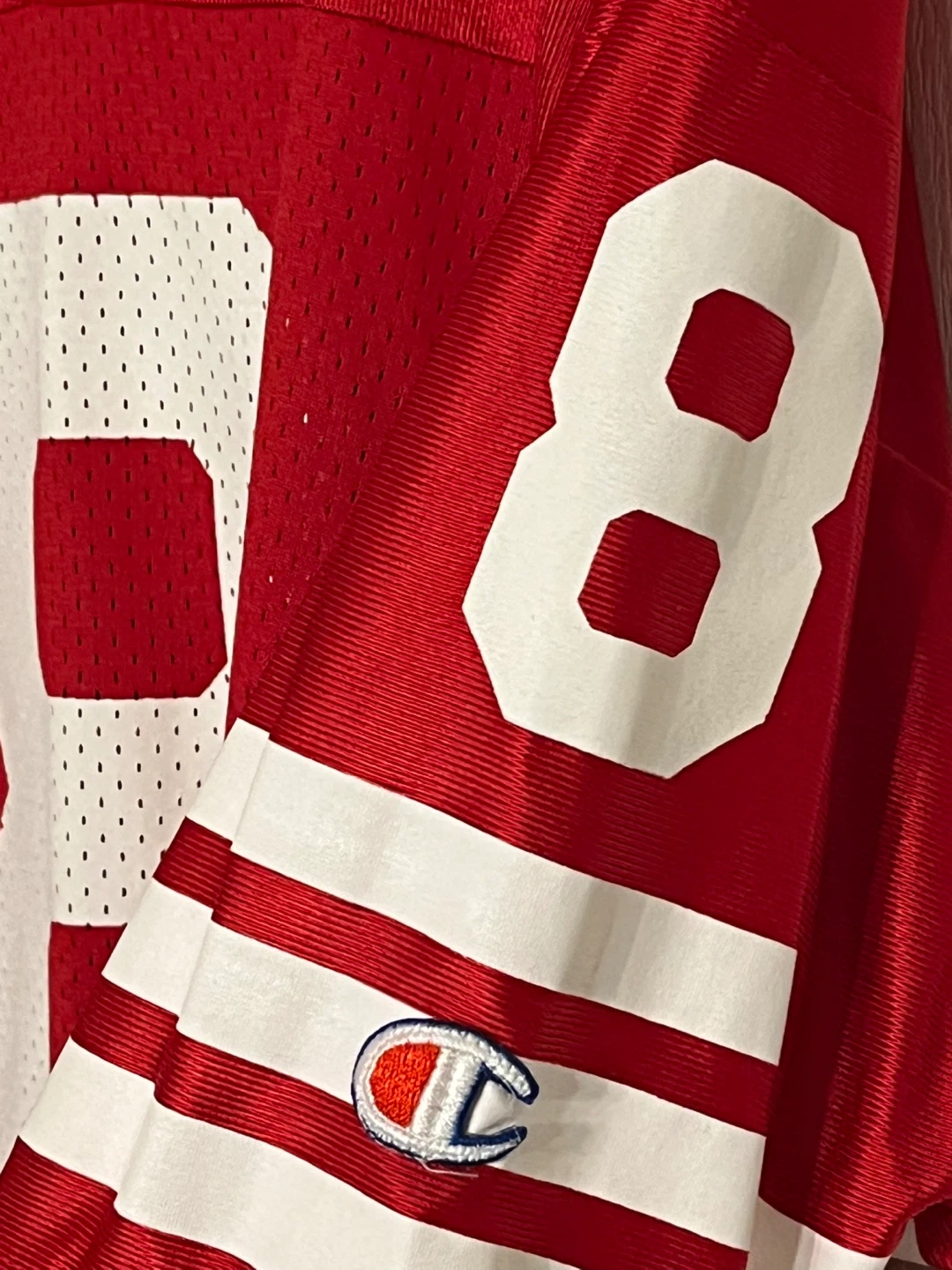 Vintage San Francisco 49ers Champion Steve Young jersey in size 44 (Men’s size Large) The jersey is red and features the number 8 on the front and back, along with "YOUNG" on the back. It also has the Champion logo on the sleeves and bottom front. A great Vintage piece for any 49ers football fan!