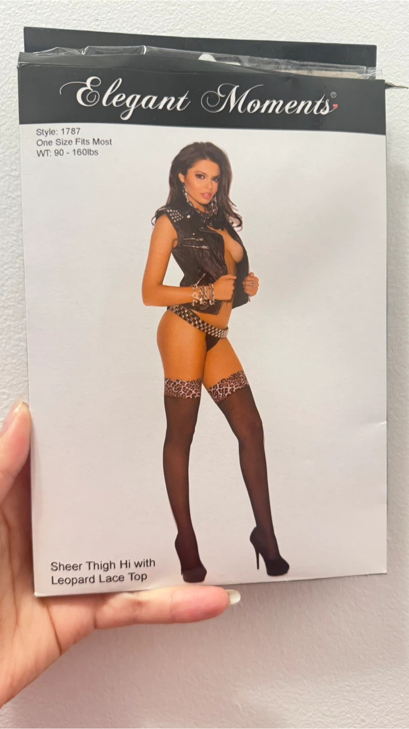 Sheer thigh hi stockings with a leopard lace 2 set. One size fits most. Made of 100% nylon. Hand wash separately in luke warm water, drip dry. Do not bleach.
