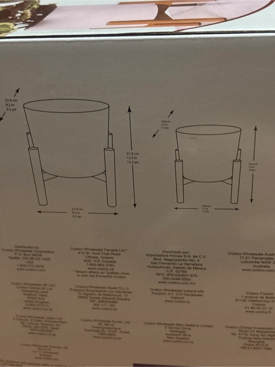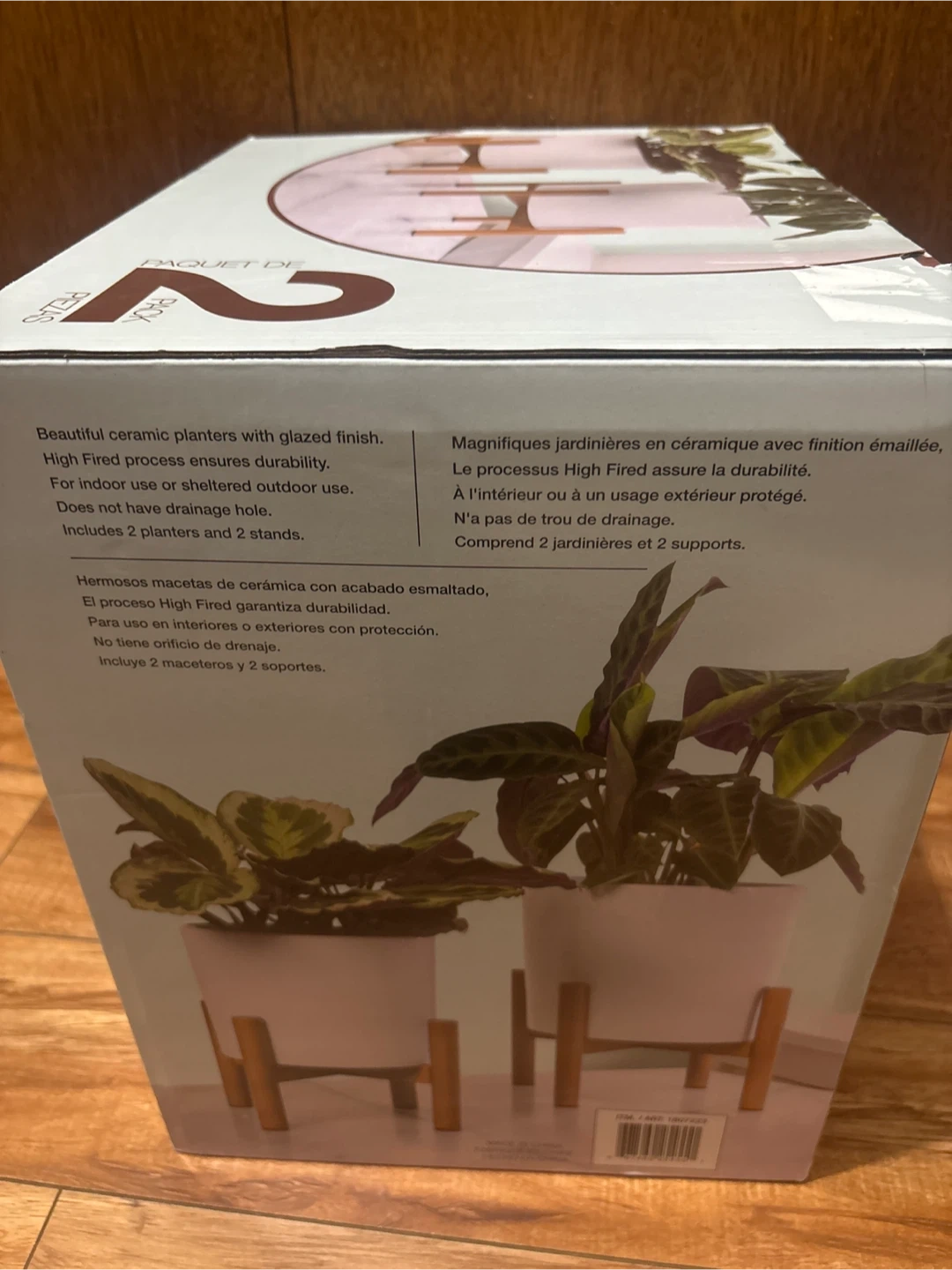These are beautiful ceramic planters with a glazed finish, perfect for indoor or sheltered outdoor use. The box includes two planters and two stands! The dimensions are 23.4 cm x 9.2 cm for the larger planter, and 19.8 cm x 7.7 cm for the smaller planter