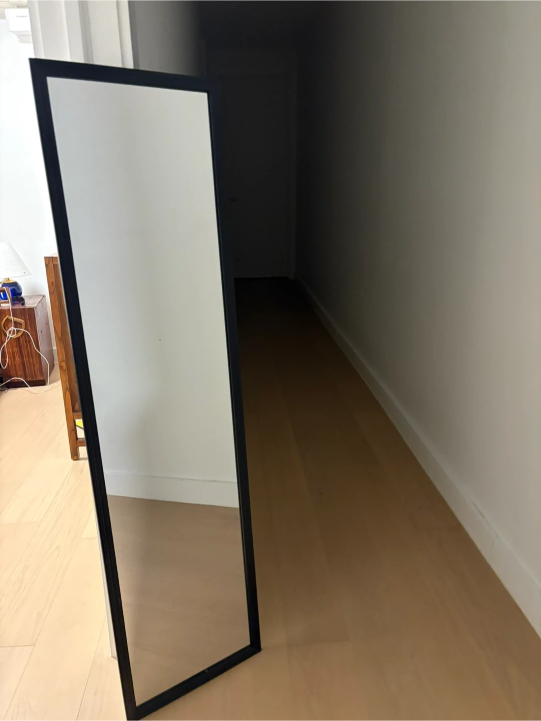 Tall standing mirror with a simple black frame. Great for checking your outfit before heading out. It's lightweight and easy to move around your room or hang on a door.