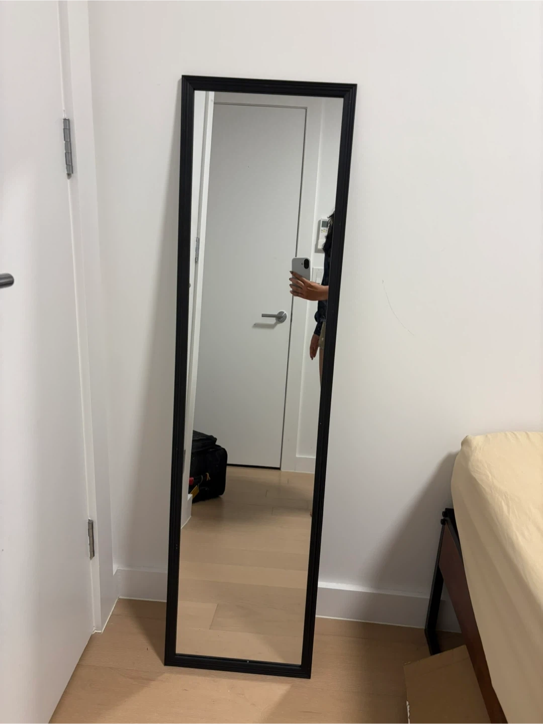 Tall standing mirror with a simple black frame. Great for checking your outfit before heading out. It's lightweight and easy to move around your room or hang on a door.