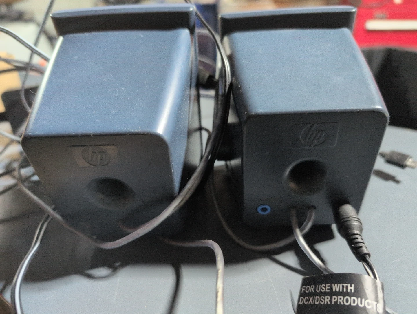 Compact Harman Kardon computer speakers for your desktop setup. They're designed for clear audio output. Power requirement is 12V --- 1.0A. Comes with all necessary cables.