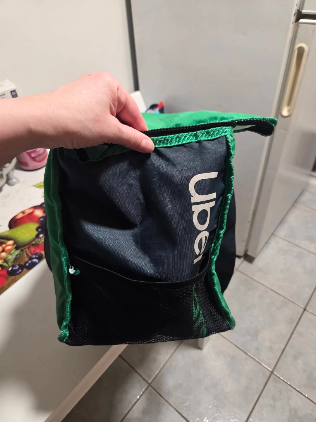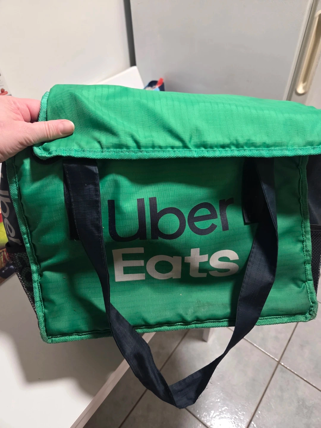 Green Uber Eats insulated delivery bag. It's great for keeping food hot or cold during transport. Features a durable exterior and a silver insulated interior.