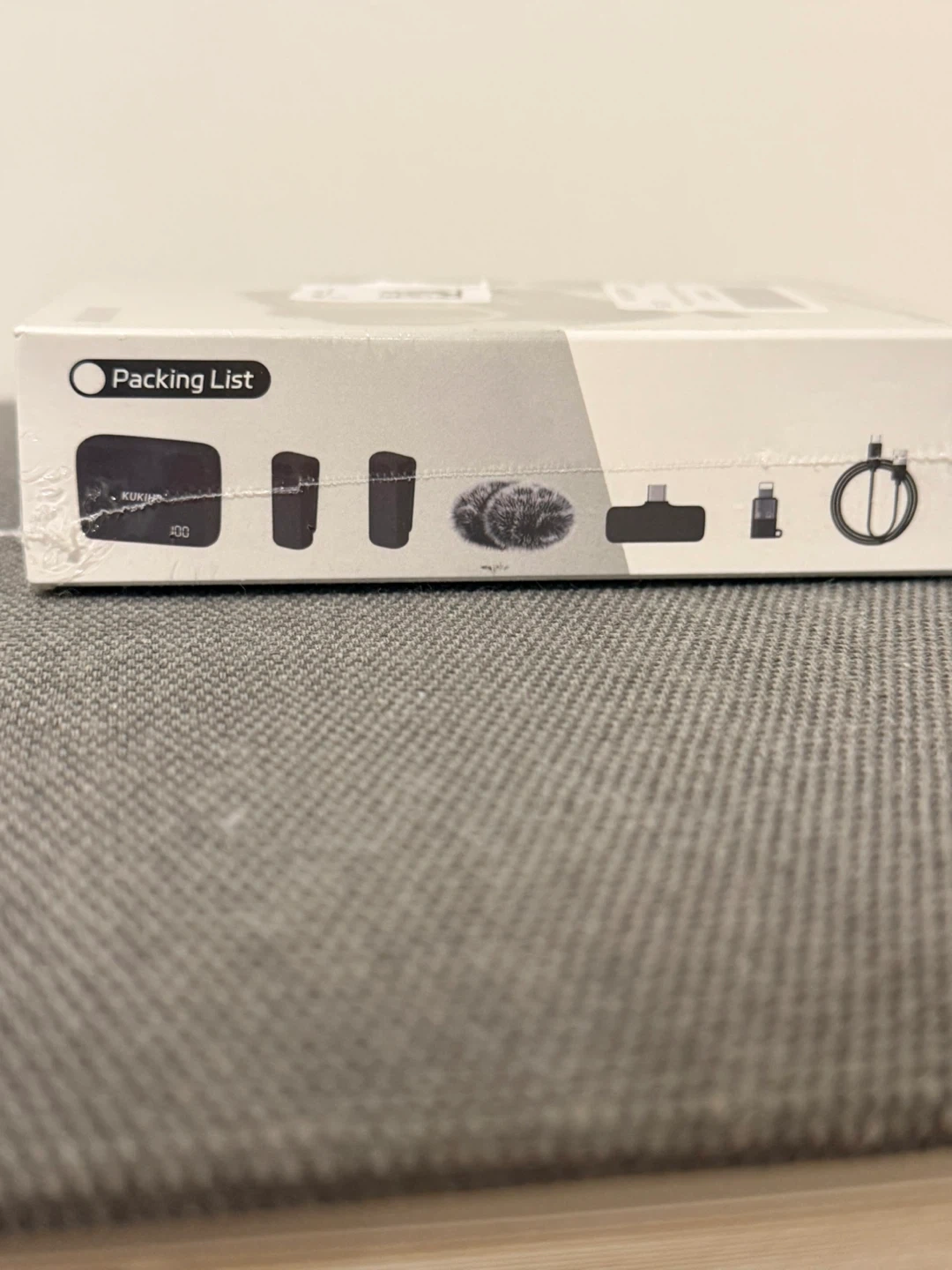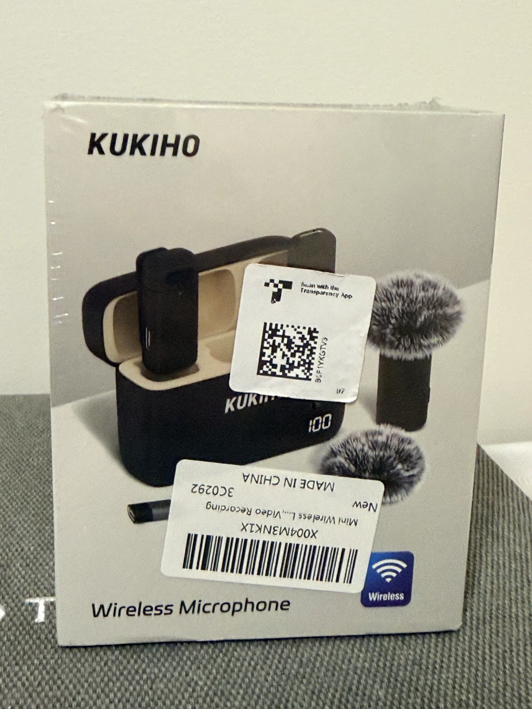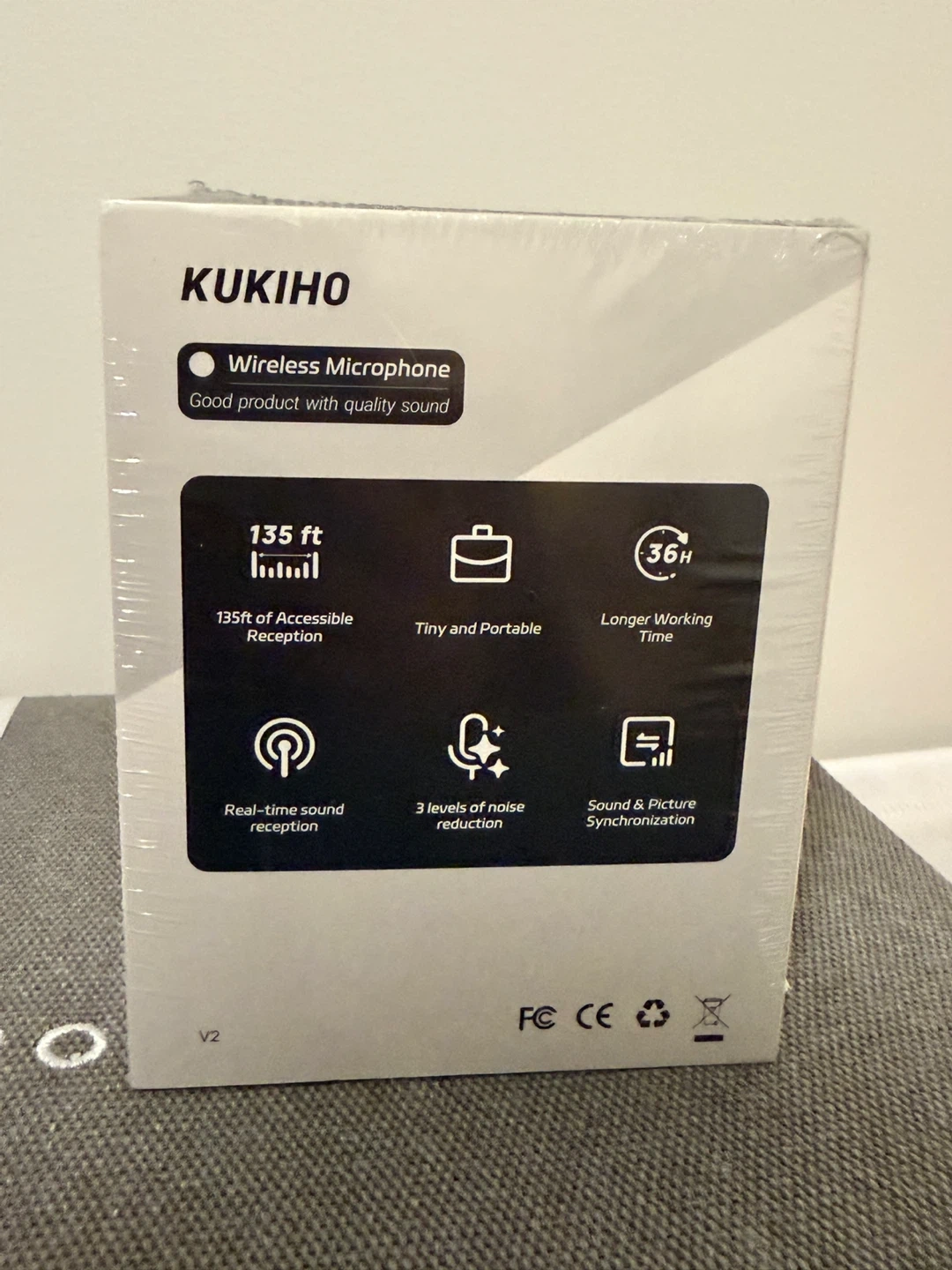 KUKIHO wireless microphone set for video recording. Includes charging case, microphones, and accessories. Offers 135ft reception range and 36 hours working time. It's tiny and portable, with real-time sound reception and noise reduction.