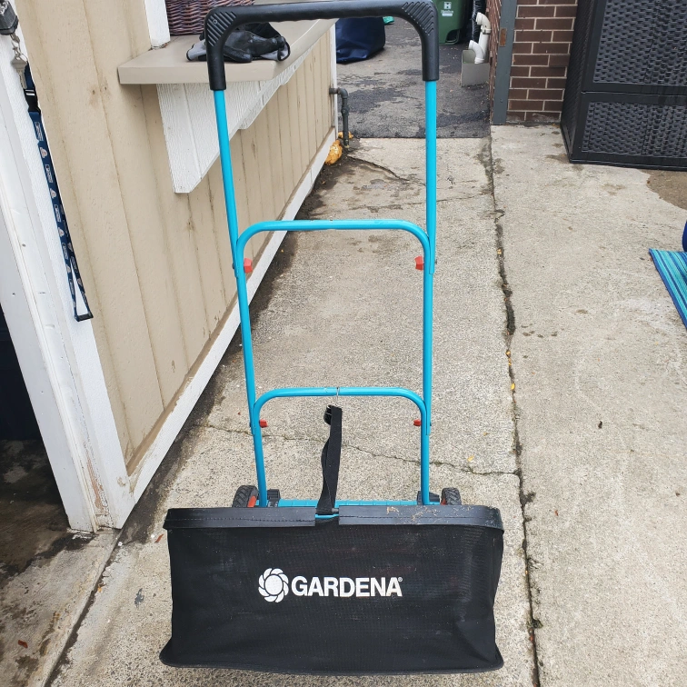 This is a Gardena reel mower with a black collection bag. It has a blue frame and orange cutting blades. The wheels are black. The handle is blue and can be folded down for easy storage. The mower has a height adjustment lever for different cutting heights. It is in good condition.